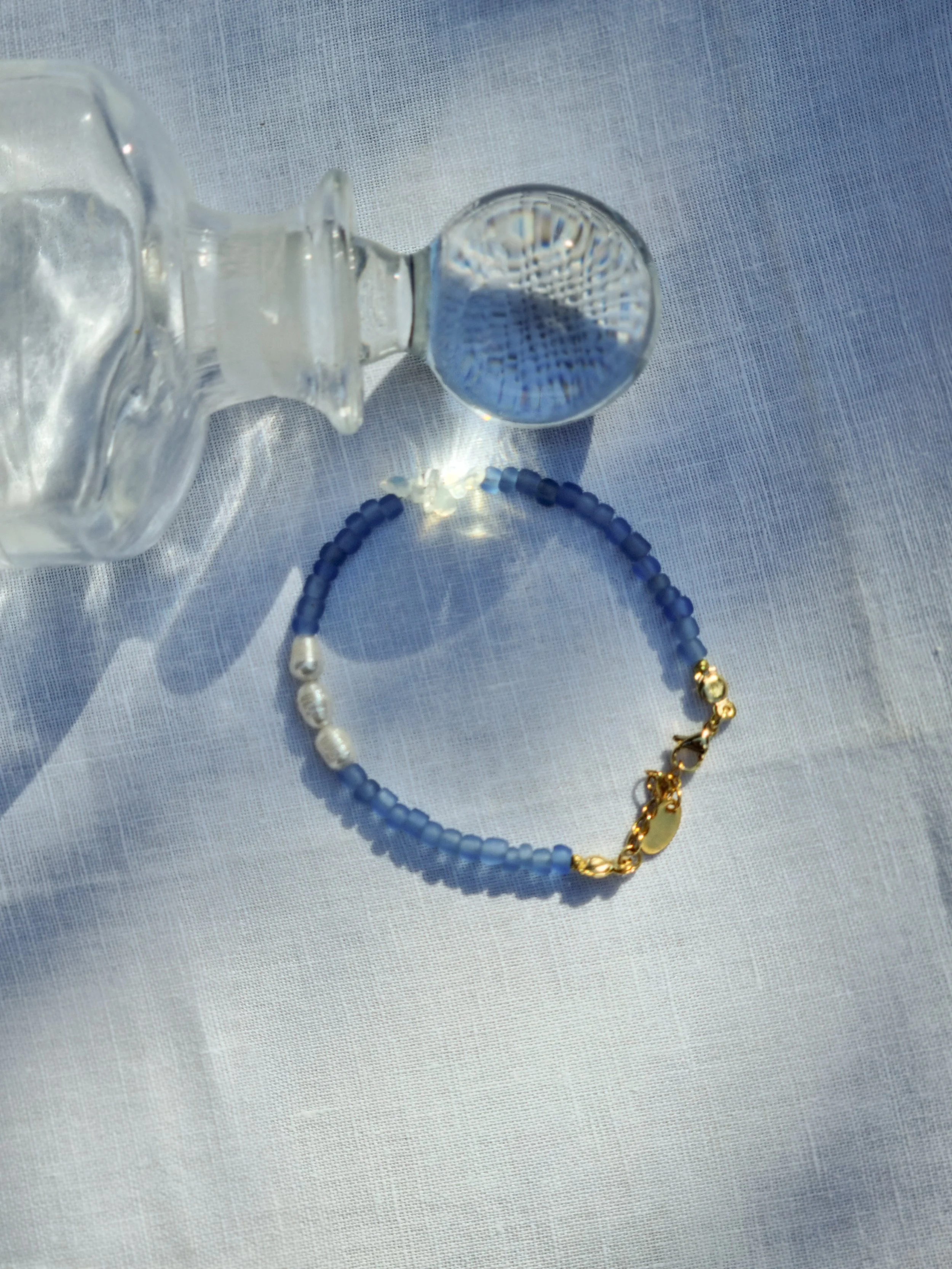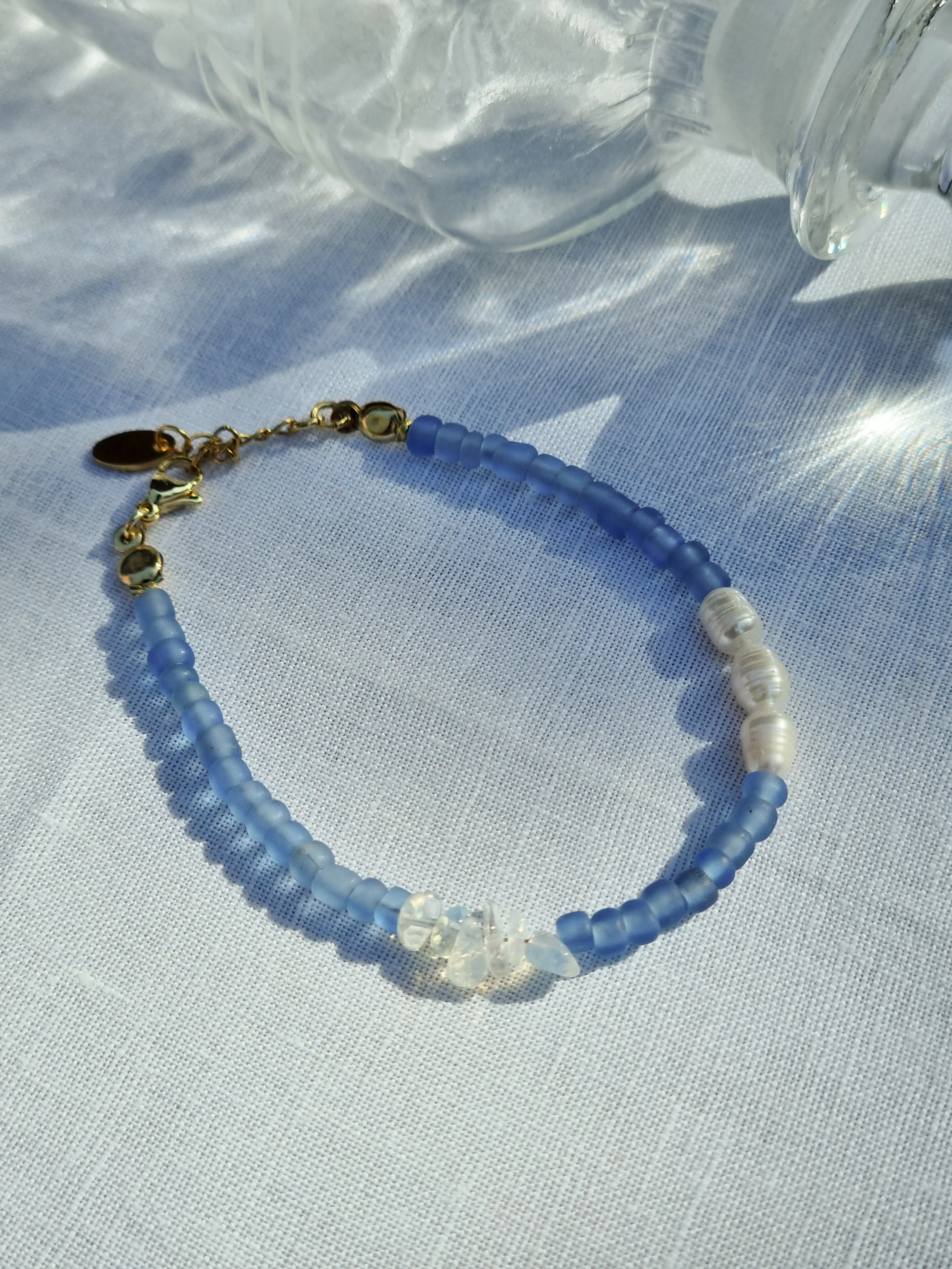 Handmade at my home studio in England, this bracelet is made with upcycled vintage and old beads featuring blue glass beads, freshwater pearls and rainbow moonstone chip beads. Gold-plated stainless steel adjustable clasps.
