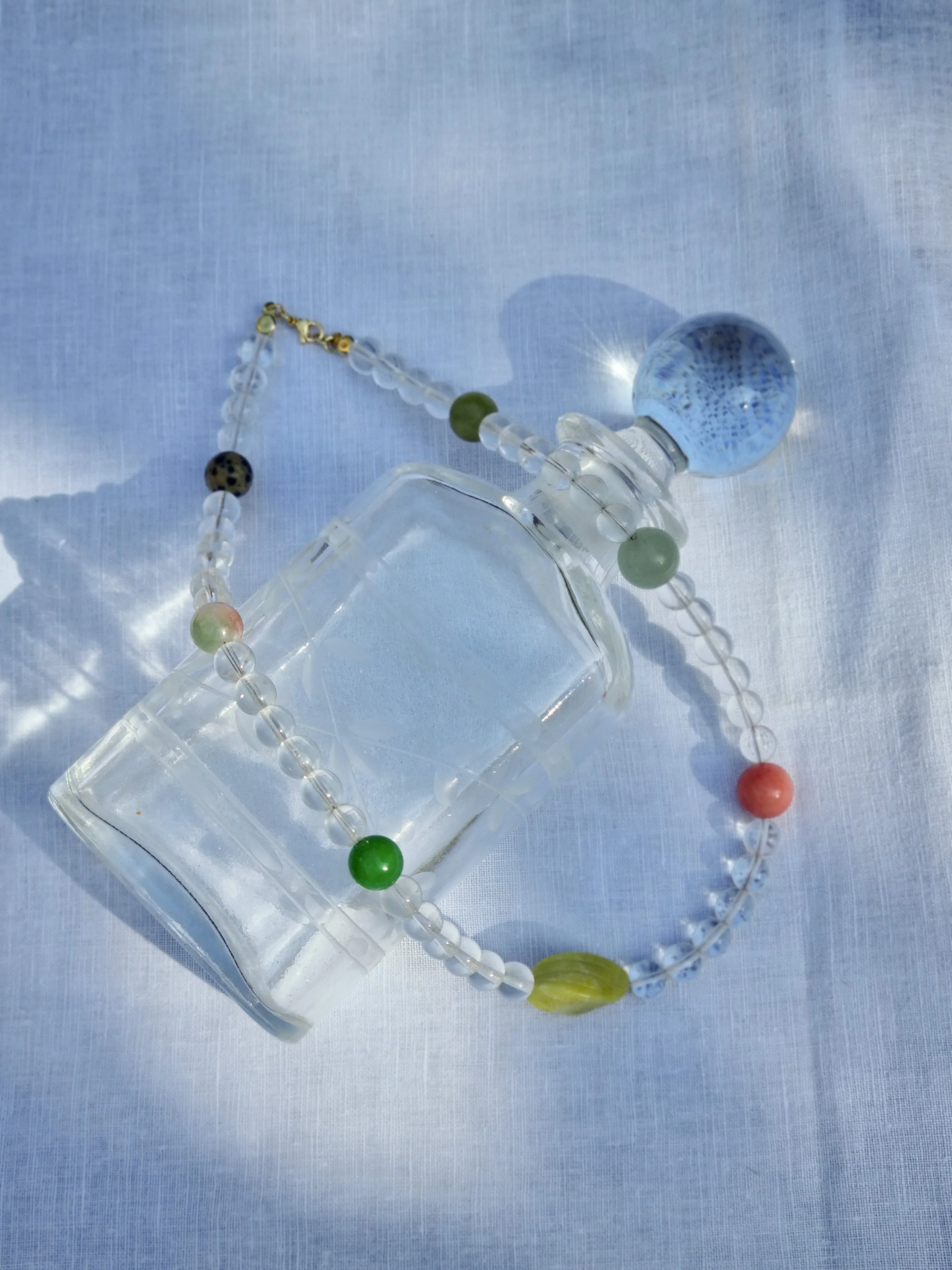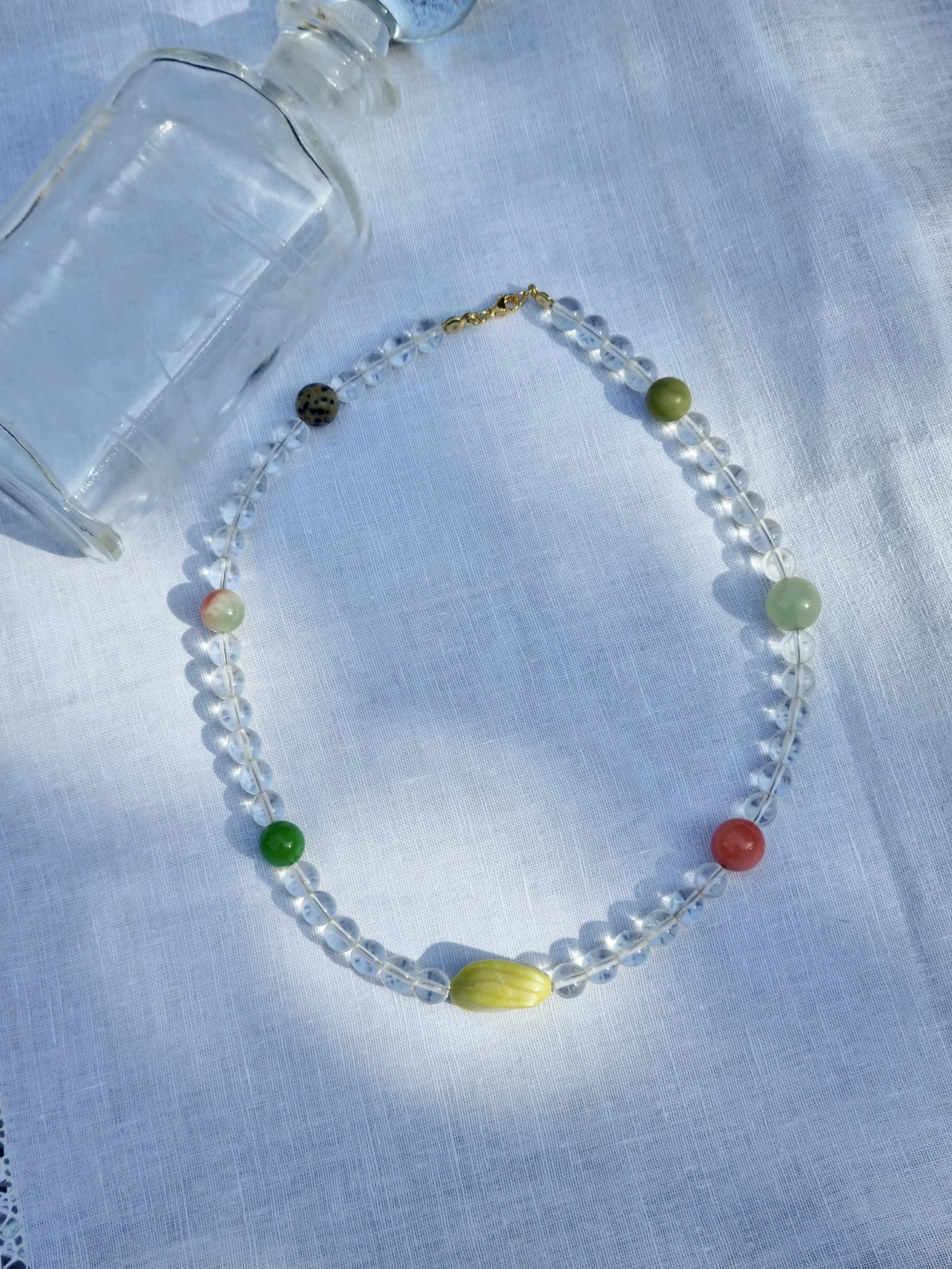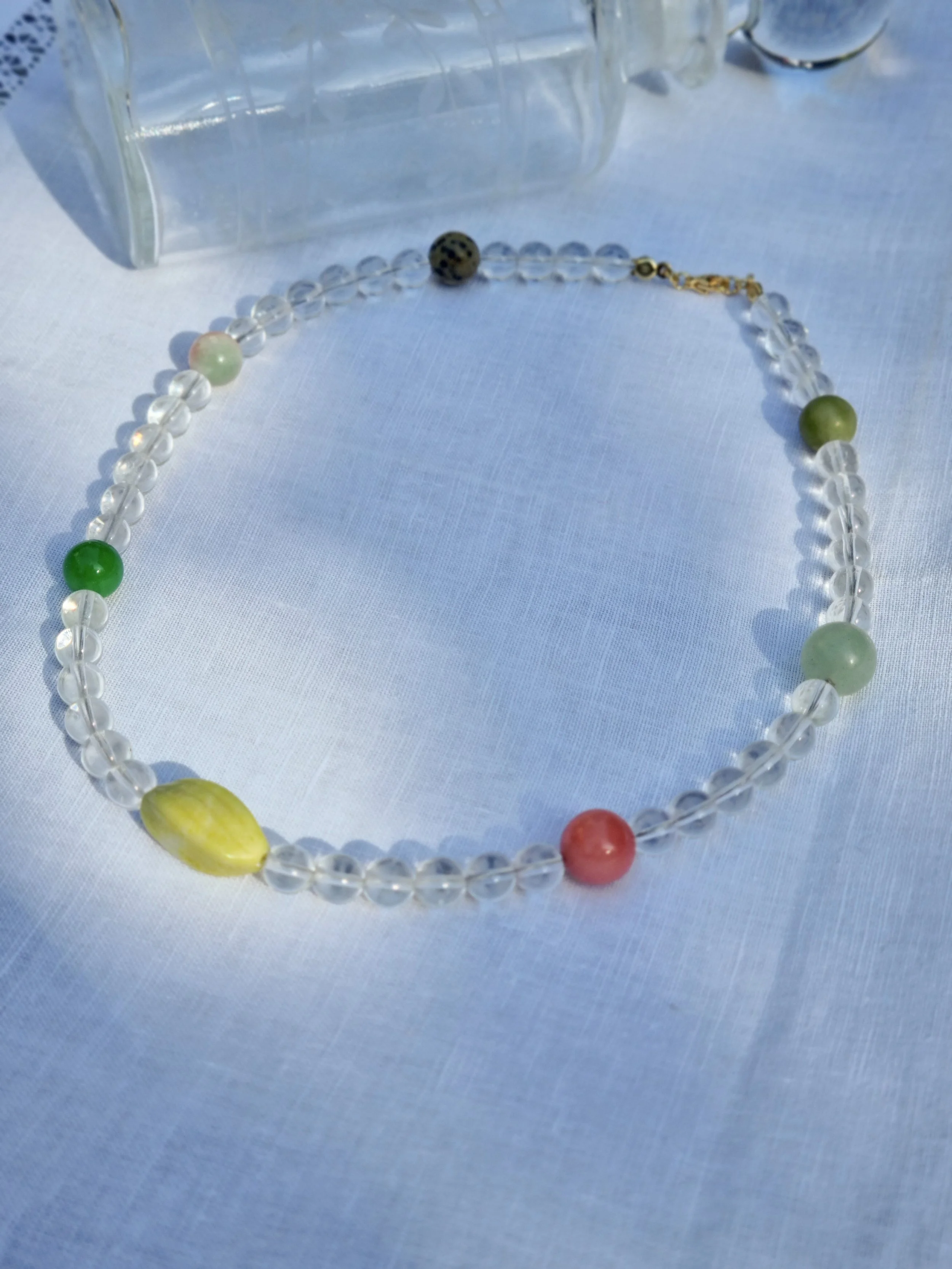 Handmade in my home studio in England. This beaded necklace is strung by hand with upcycled circle shape clear beads, accent with 6 circle gemstone beads and one beautiful carved gemstone in the middle.