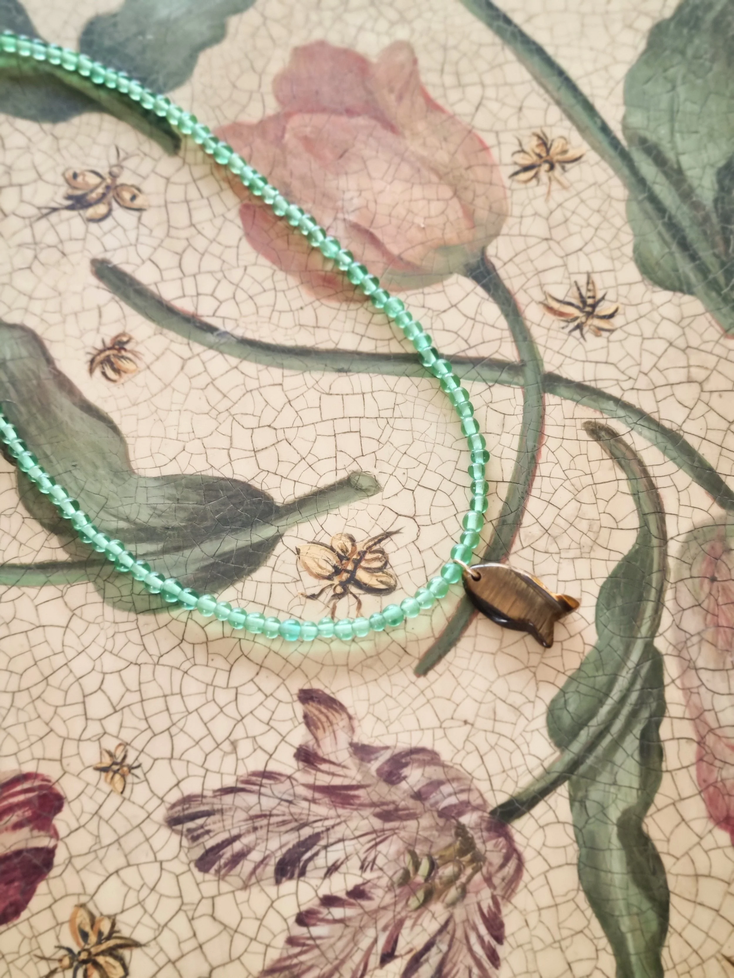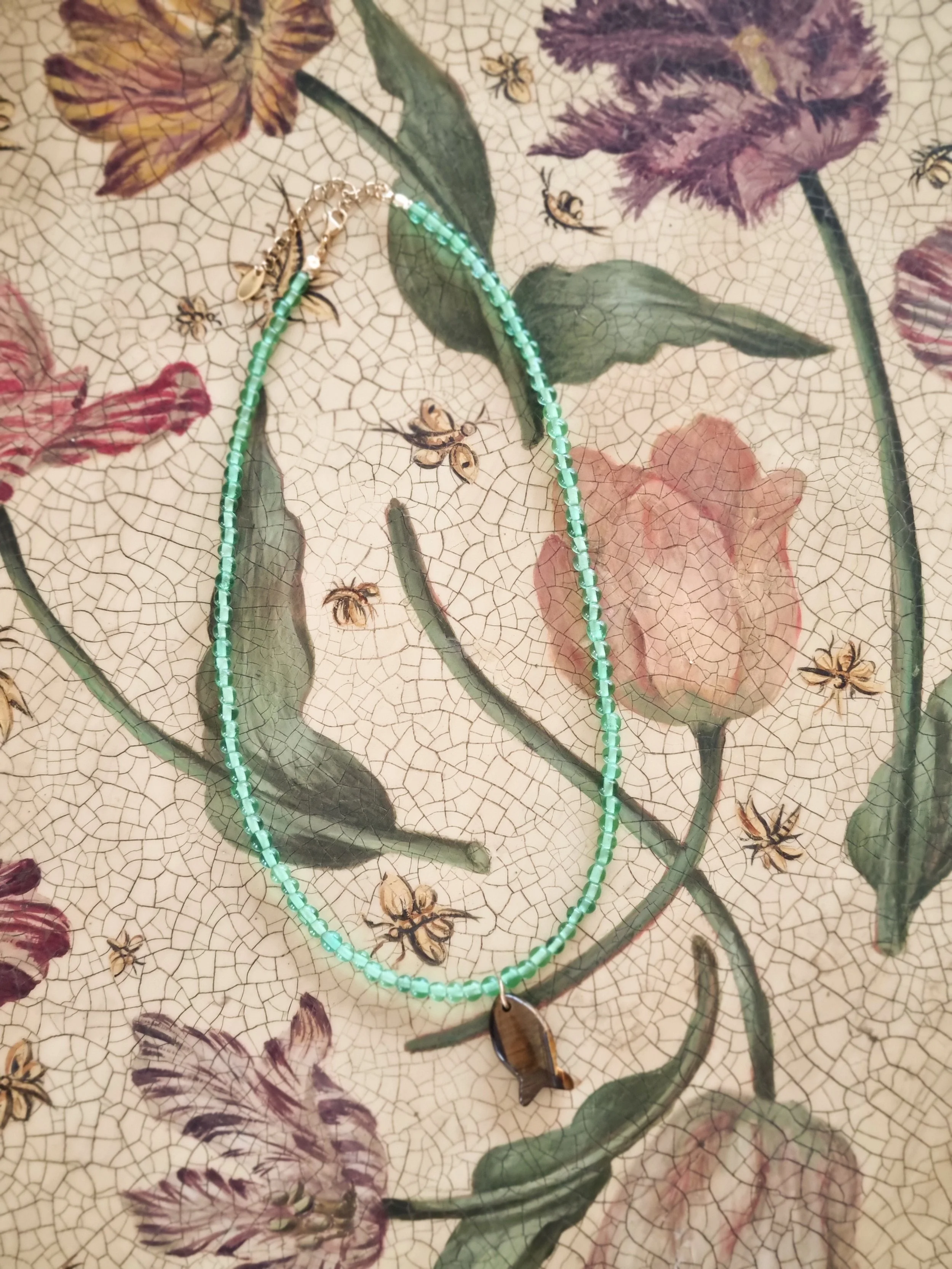 Handmade in my home studio in England. This beaded necklace is strung by hand featuring green small round upcycled glass beads and tiger eye gemstone fish shape pendant that I have handpicked from my trip in Thailand.
