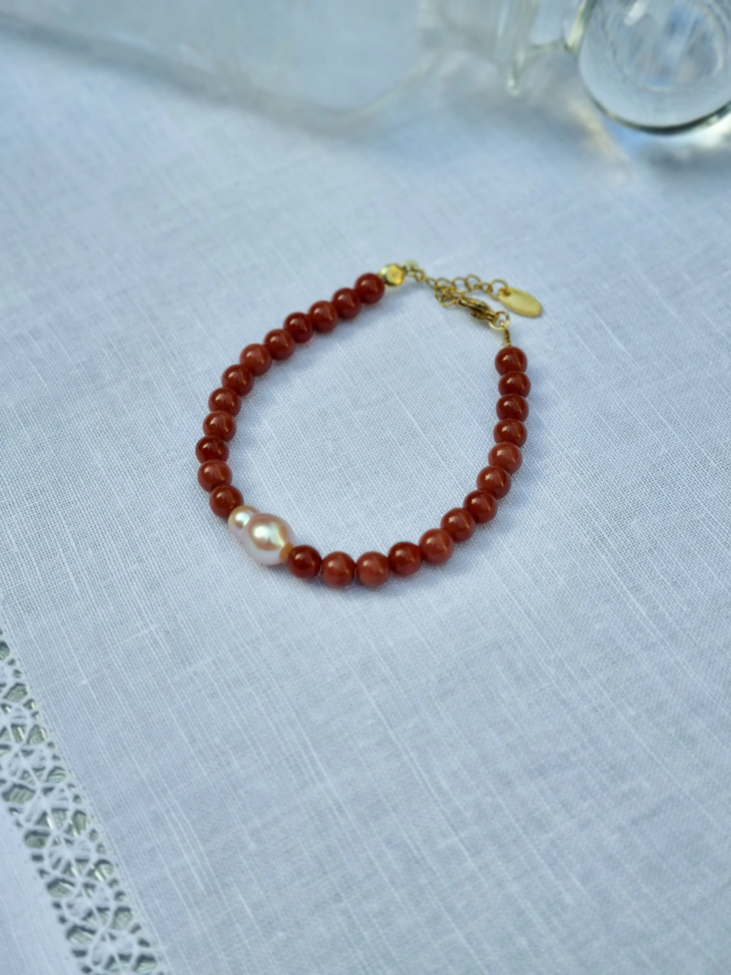 Handmade at my home studio in England, this one-off bracelet is made with upcycled brown glass beads, contrasts with pink freshwater pearl bead in the middle and gold-plated stainless steel adjustable clasps.
