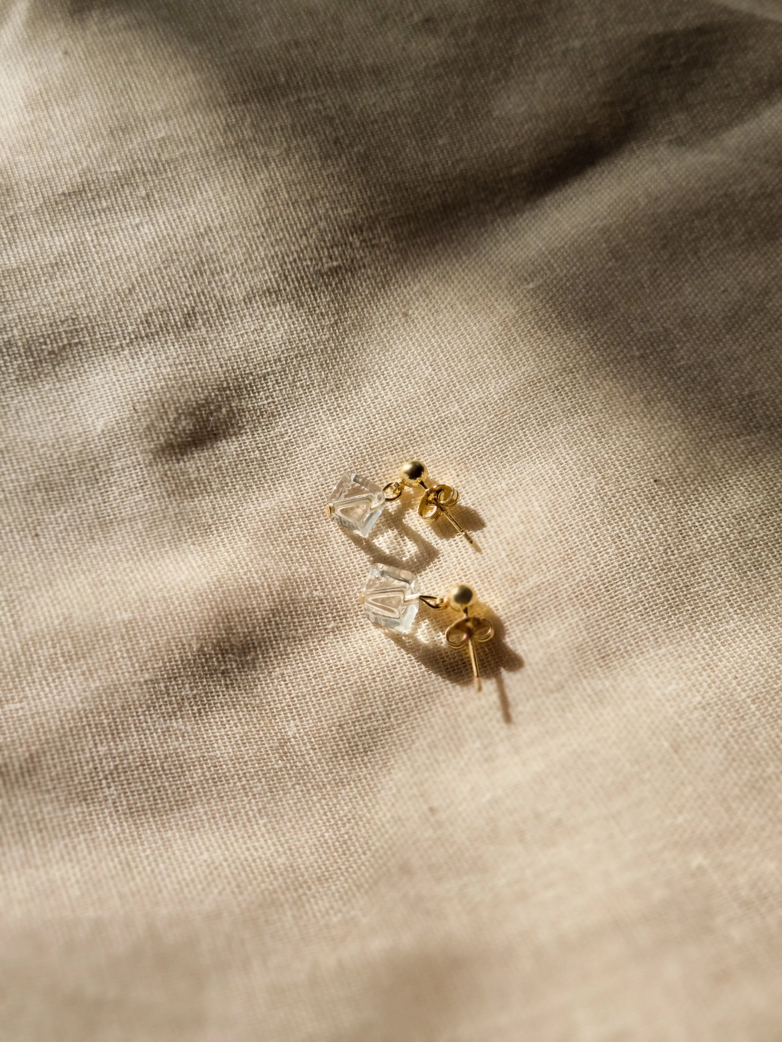 Handmade at my home studio, England. These minimalist drop earrings feature small square shape clear quartz beads delicately suspended from gold-plated on 925 sterling silver earrings posts. The design is effortlessly elegant, perfect for both everyday wear and special occasions. The natural quartz catches the light beautifully, adding a touch of understated sophistication.