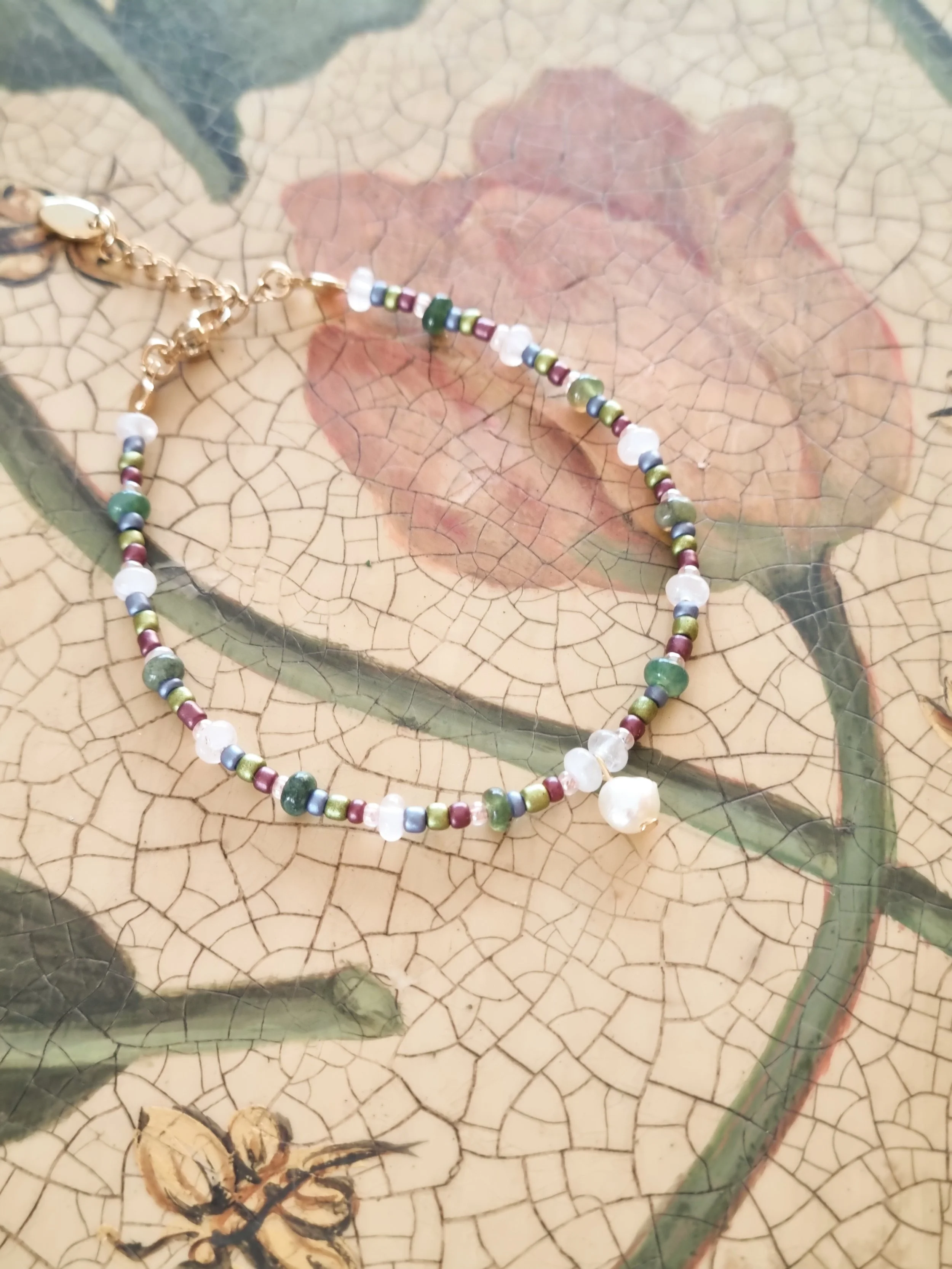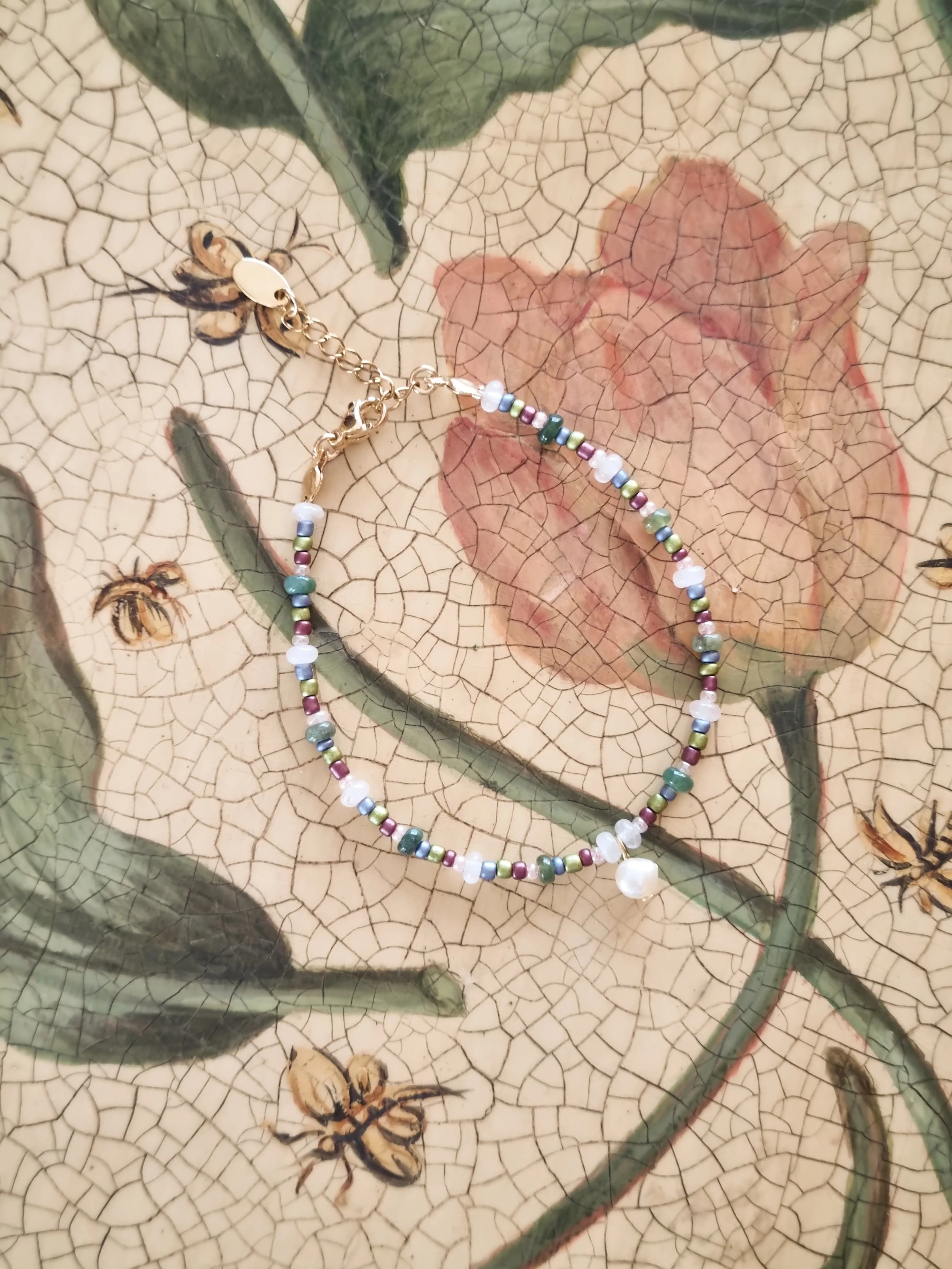 Handmade in my home studio in England. This beaded necklace is strung by hand with mixed earth tone seed beads and natural gemstones that I have handpicked from my trip in Thailand.