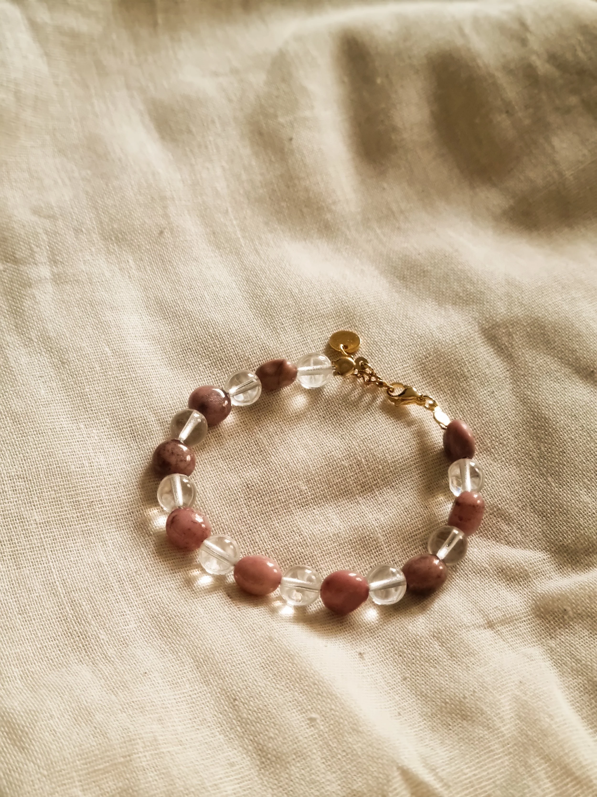 Handmade in my home studio in England. This beaded bracelet is strung by hand with upcycled mixed upcycled dusky pink gemstone beads and vintage glass beads.