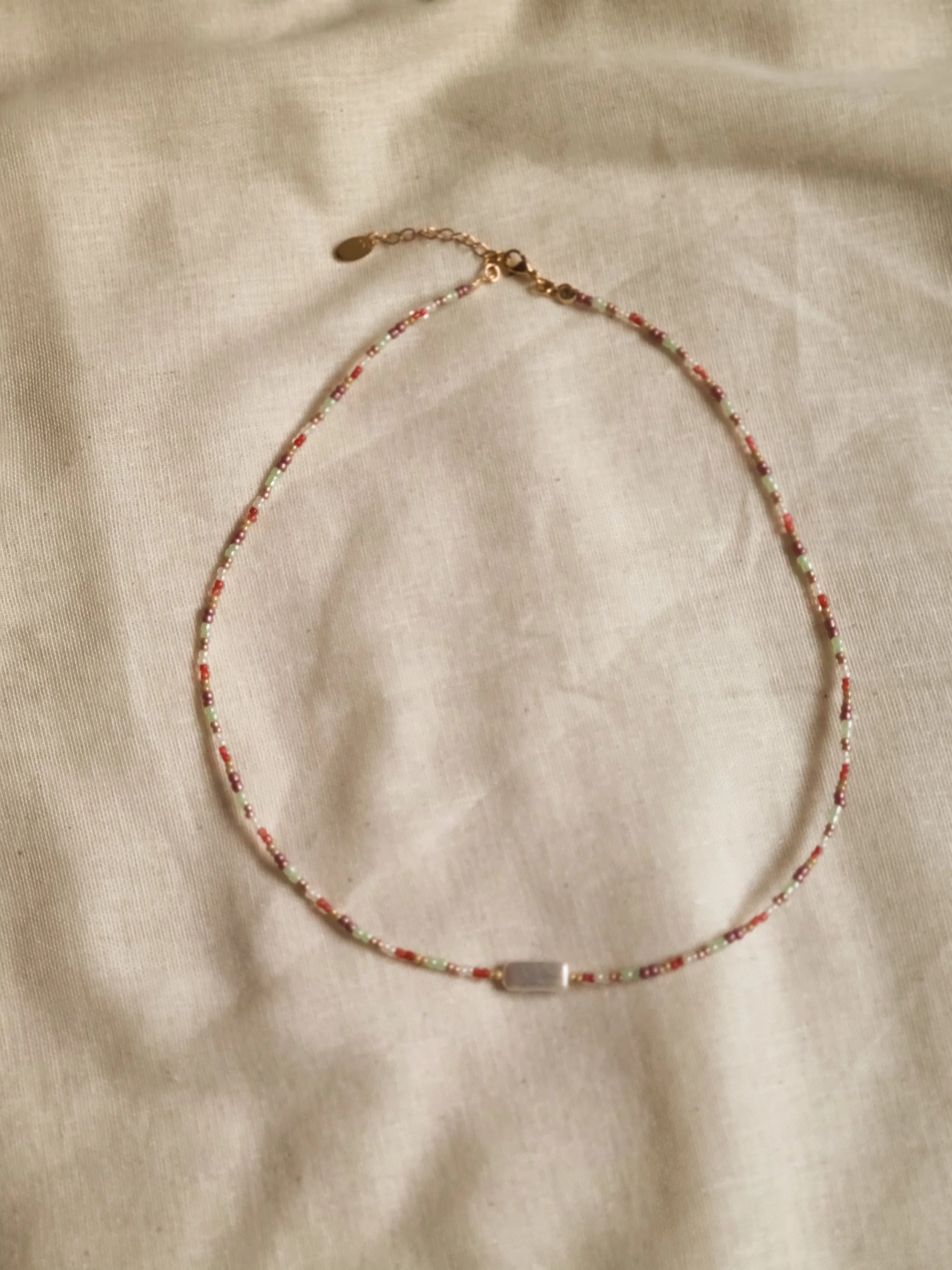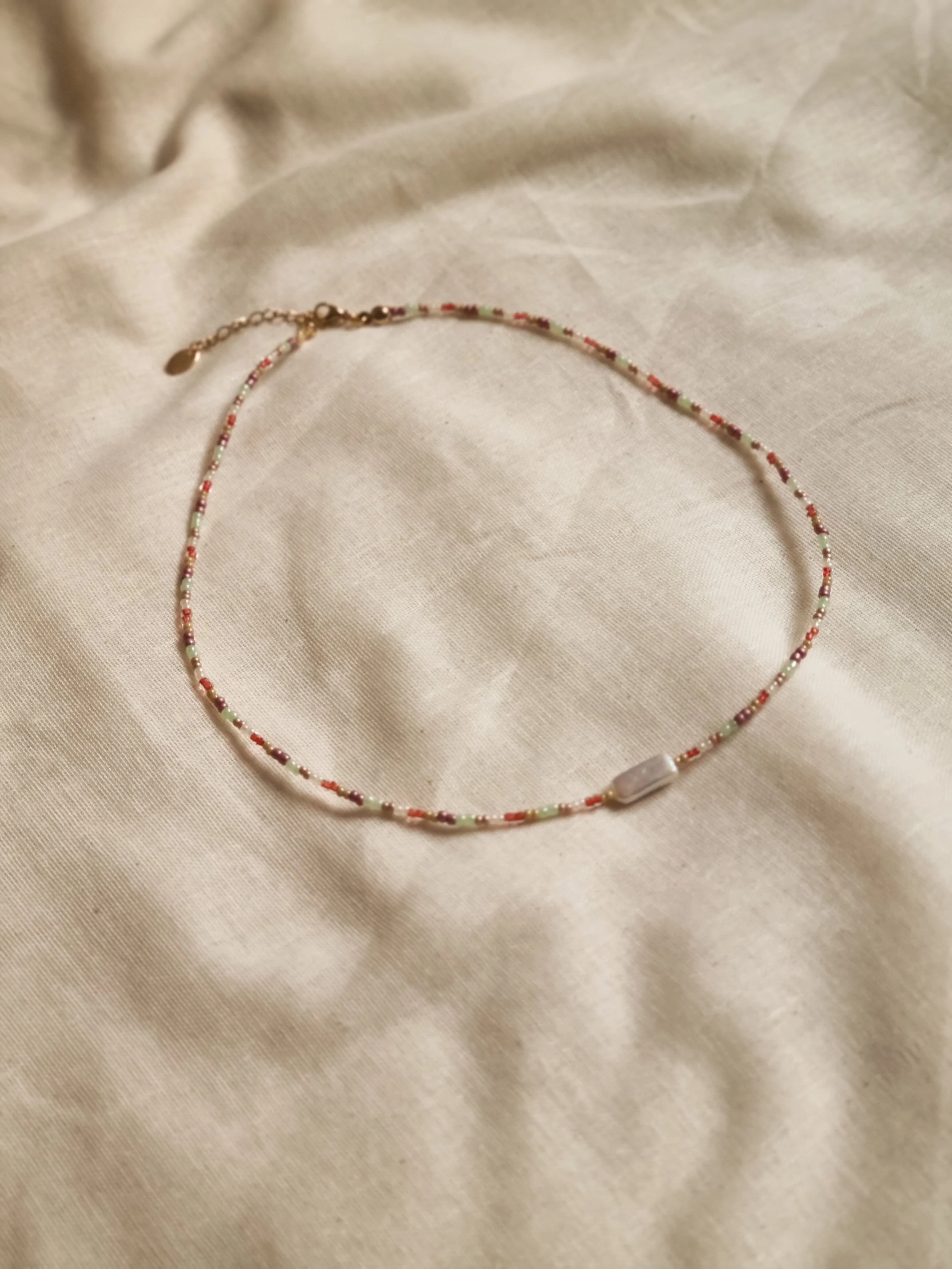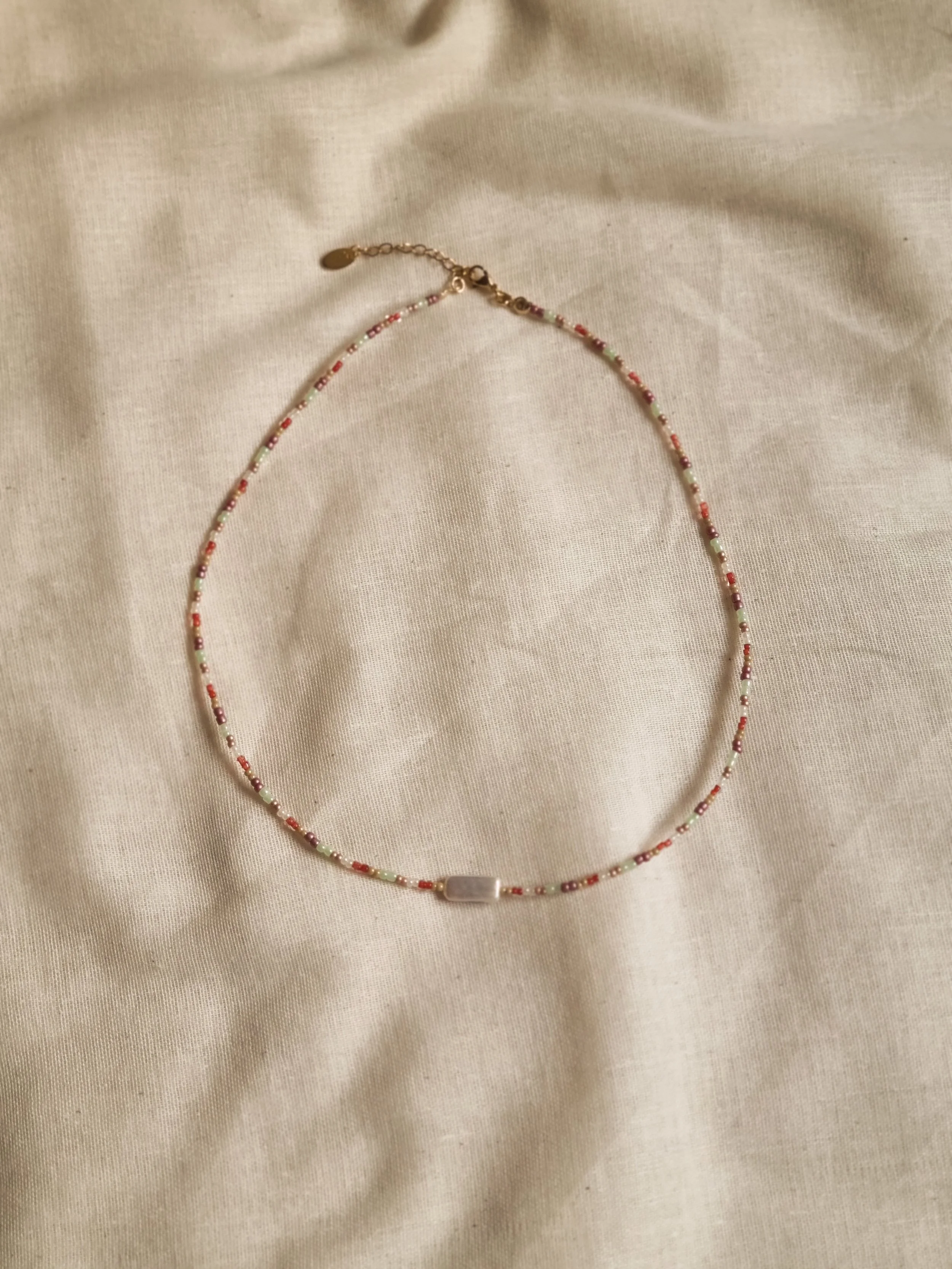 Handmade at my home studio in England, this one-off necklace is made with small autumnal colour palette seed beads and a keshi pearl in the middle. This necklace is adjustable as it has gold-plated stainless steel extender and clasps.