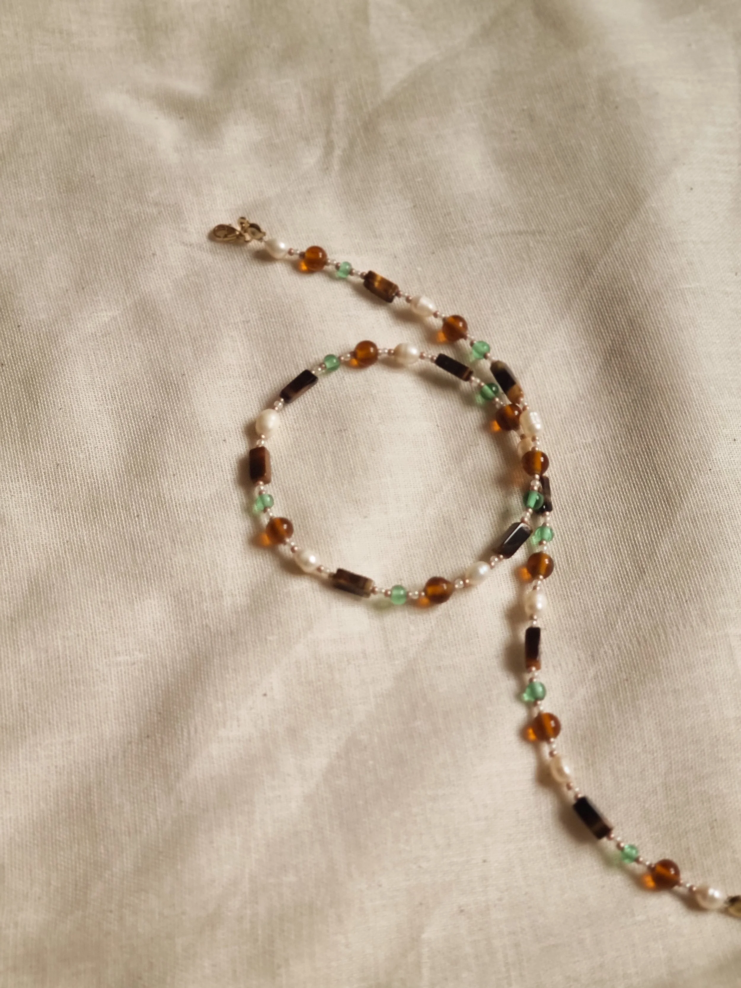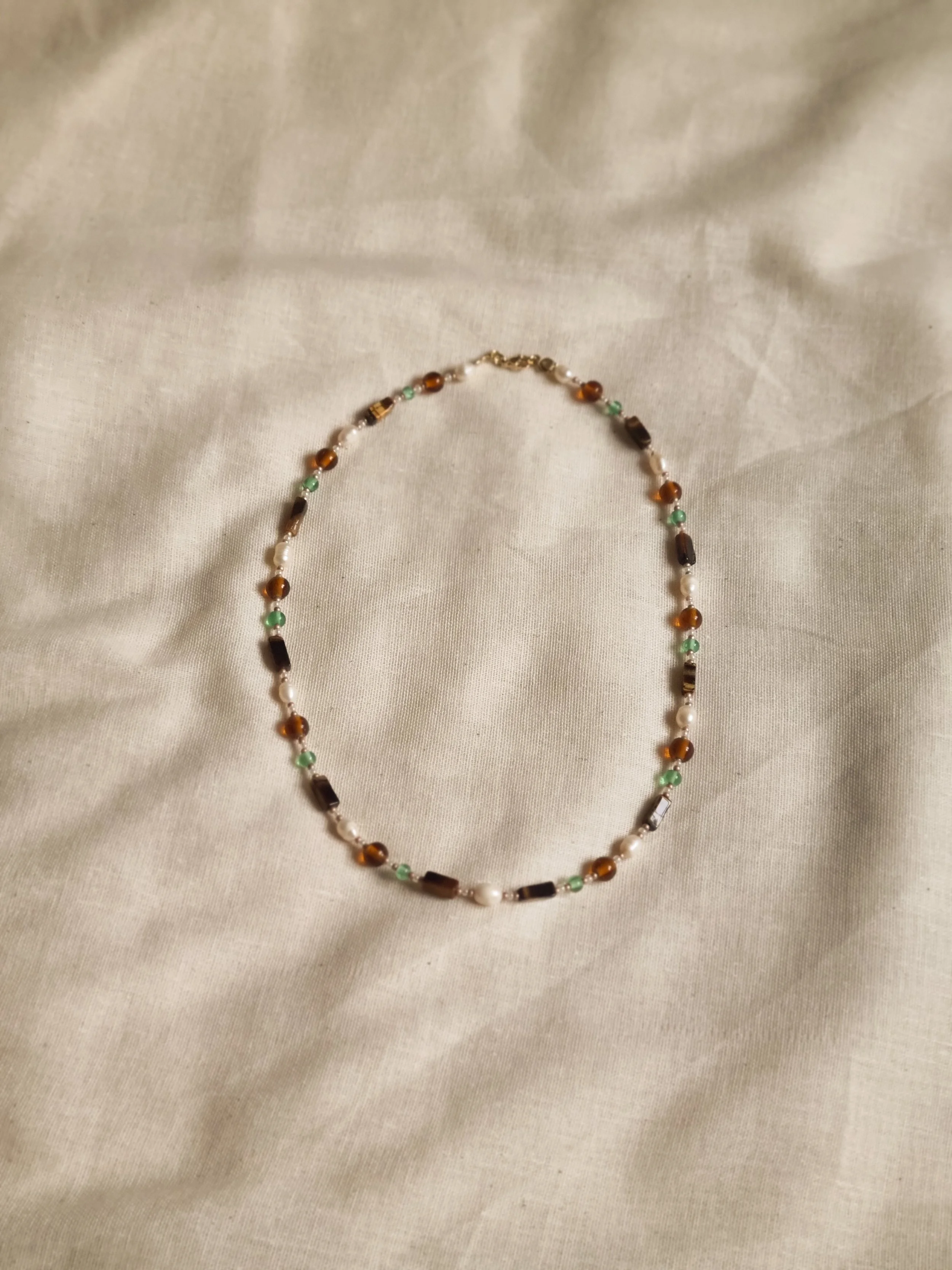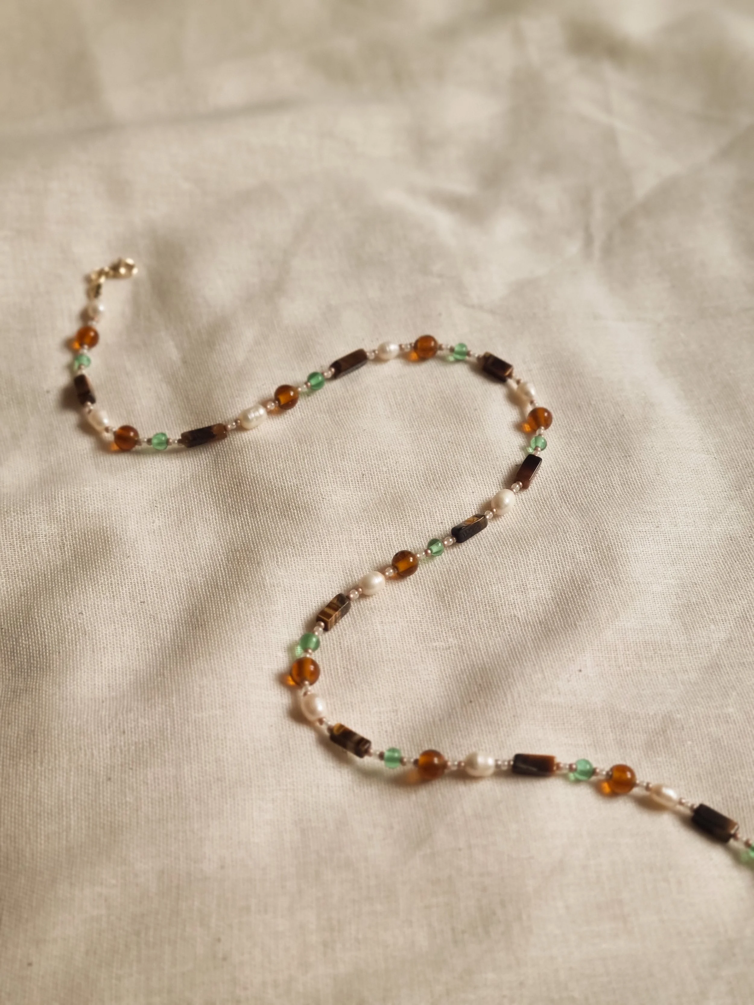 Handmade at my home studio in England, this one-off necklace is made with upcycled vintage and old beads featuring autumnal colour palette and tiger eye gemstone beads and gold-plated stainless steel adjustable clasps.