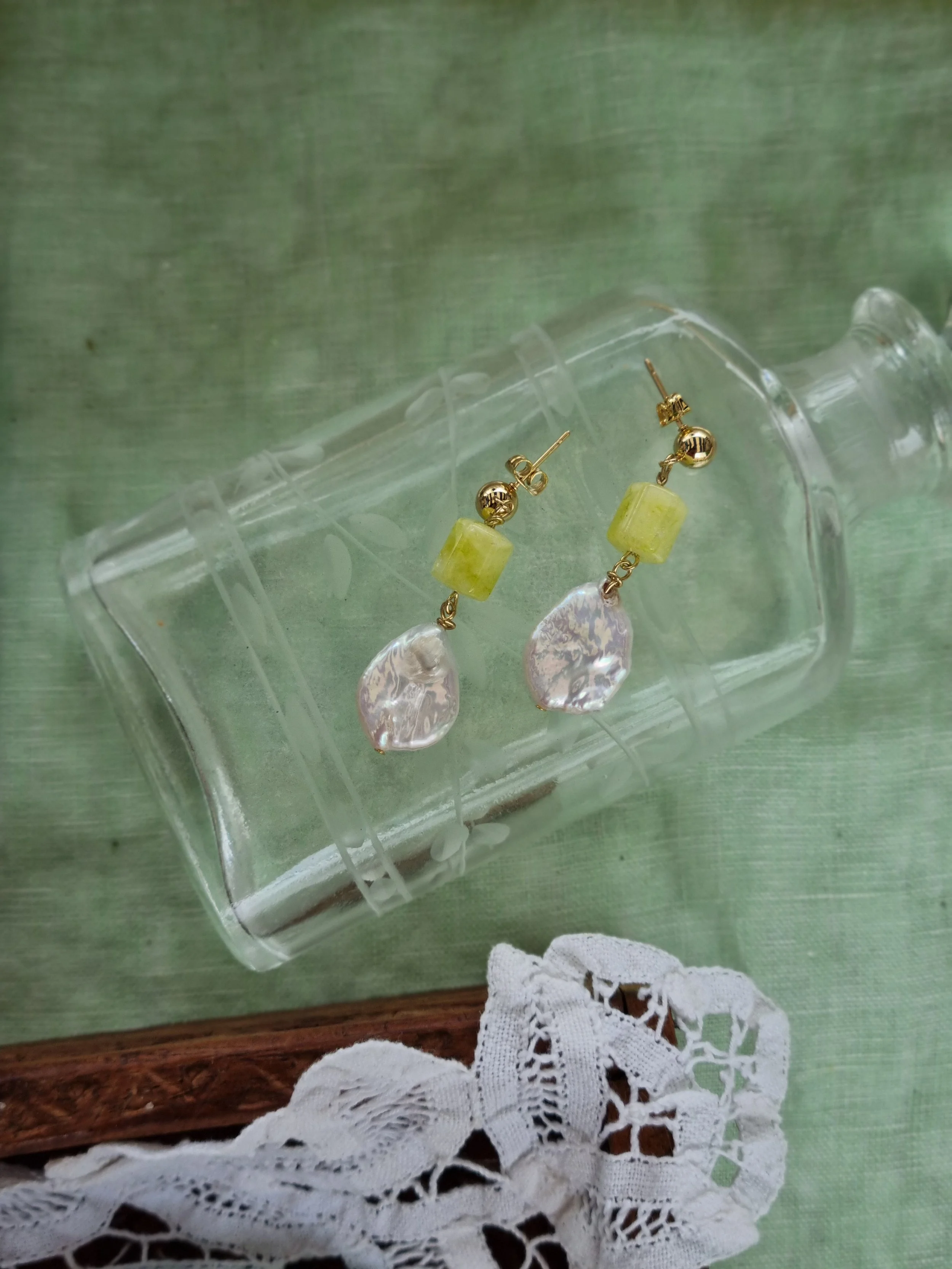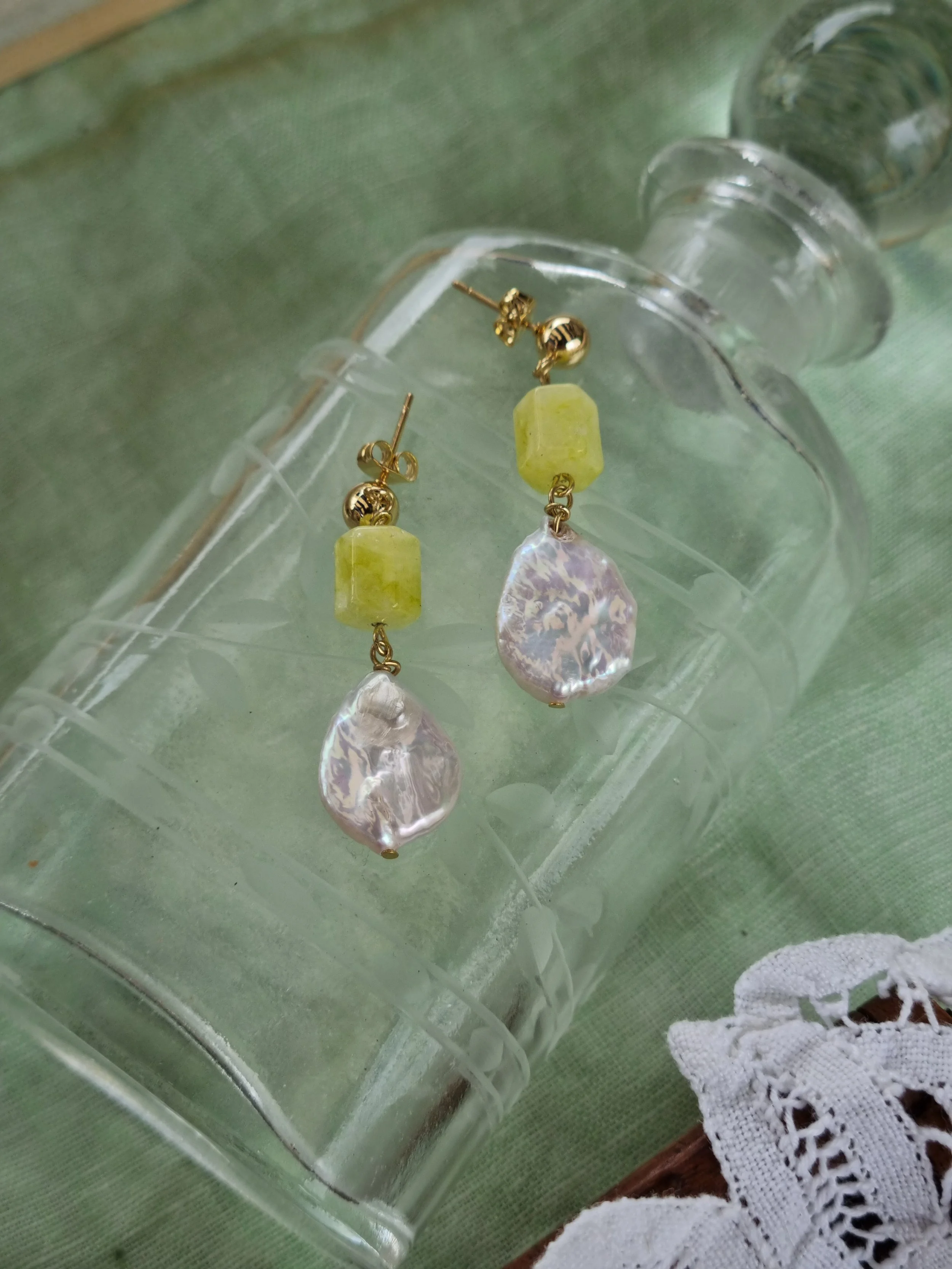 Handmade in my home studio in England. These earrings are made with green semi precious gemstones keshi pearls that I have handpicked and sourced from my recent trip in Thailand.