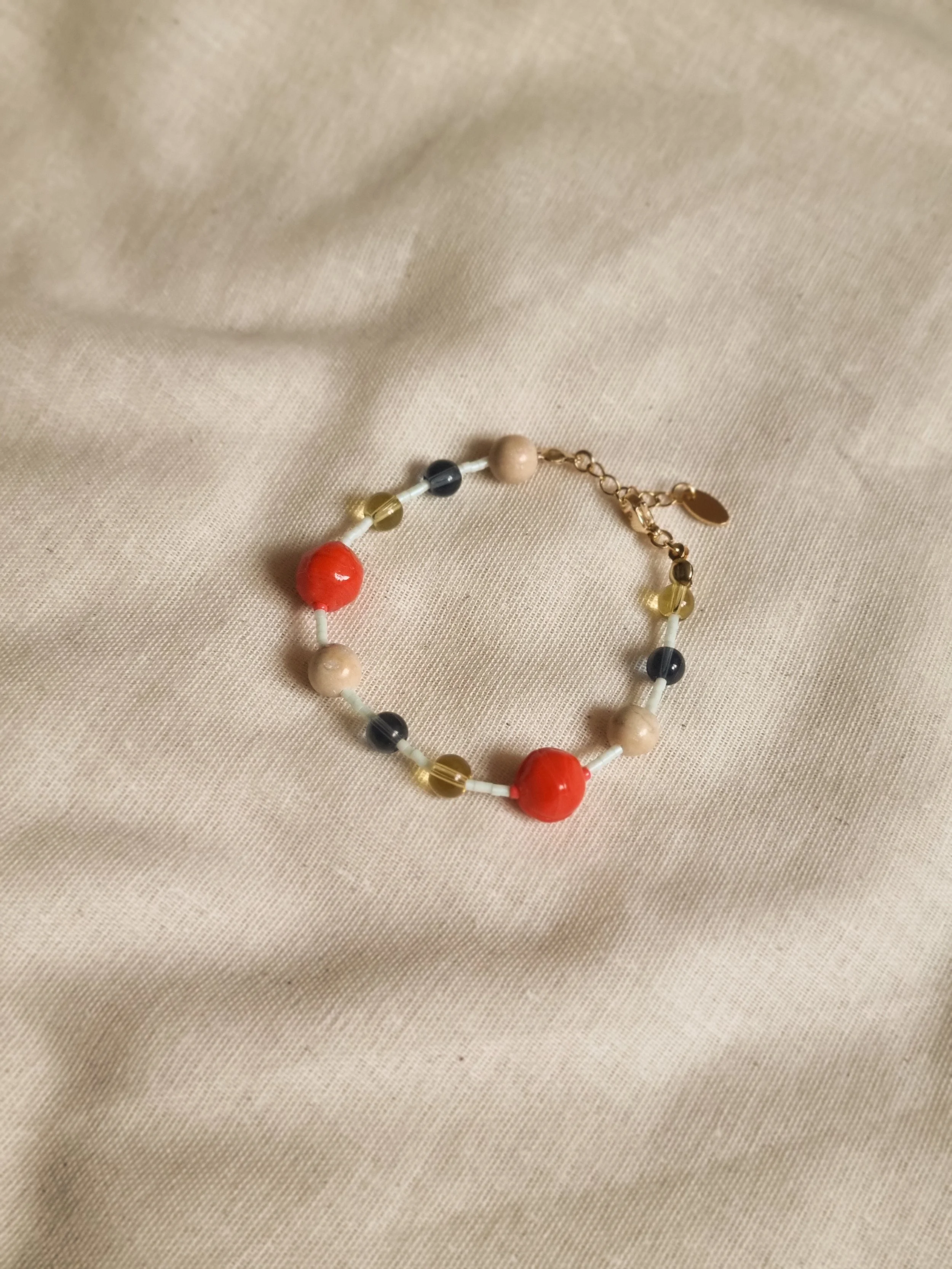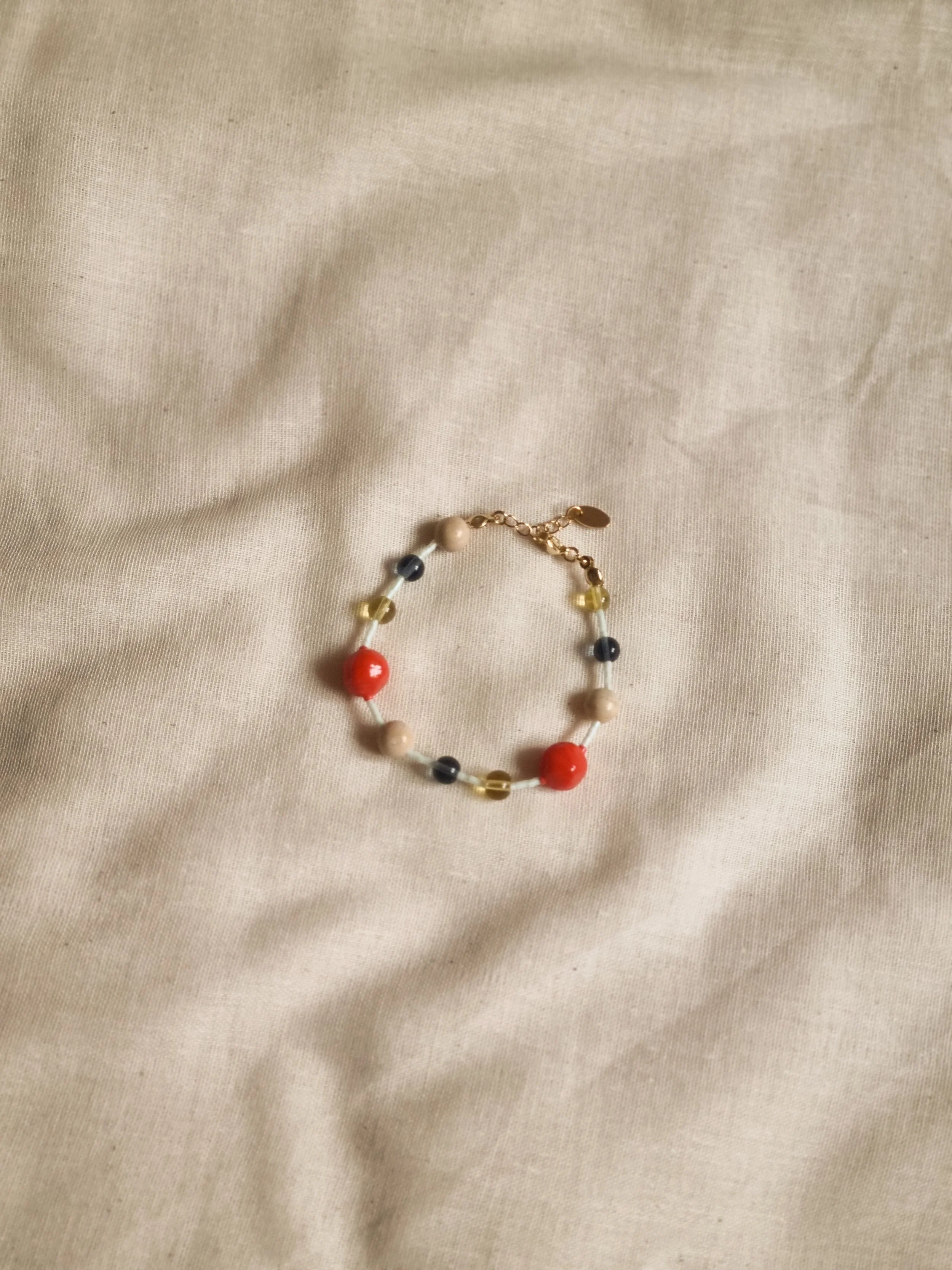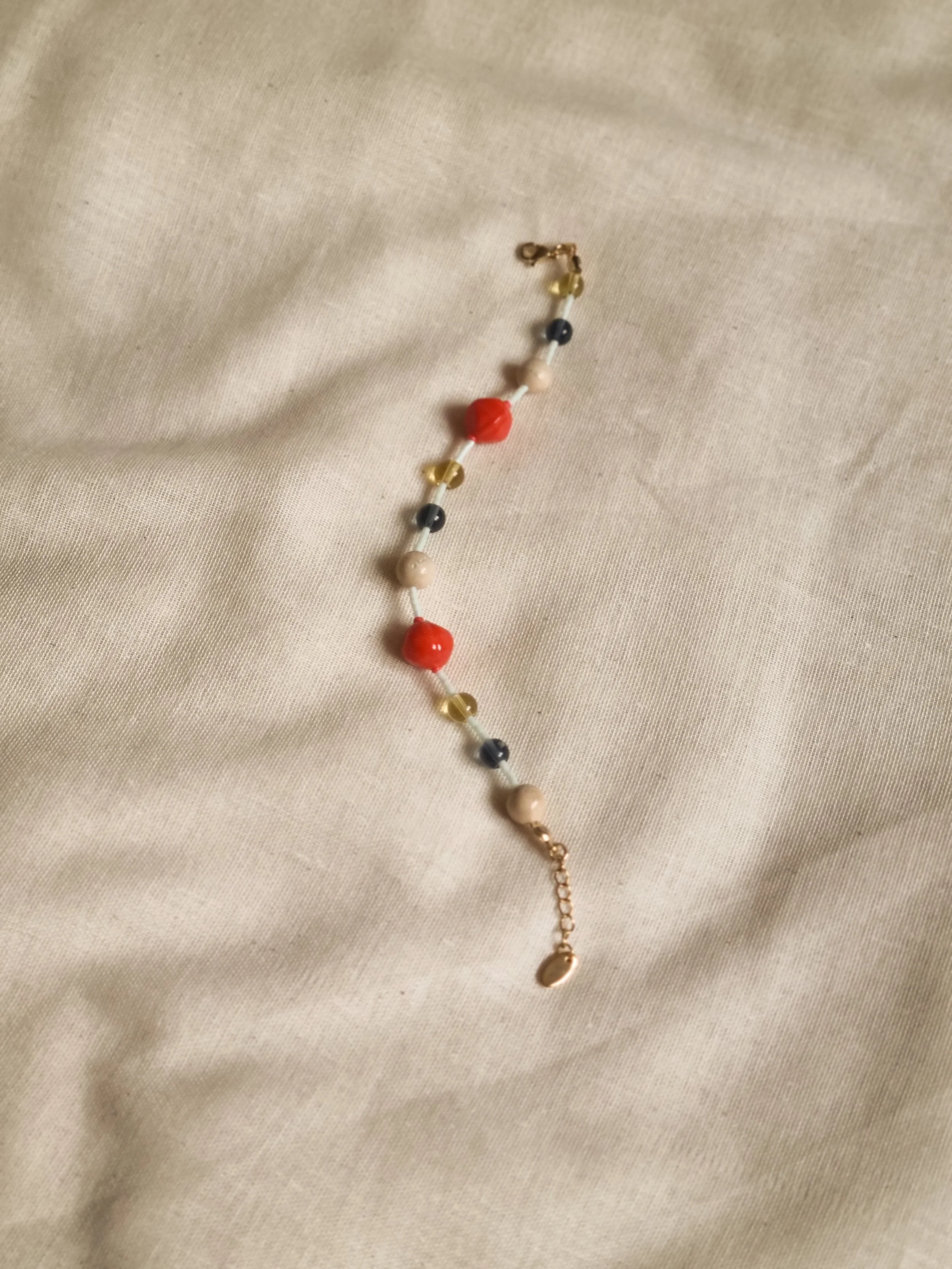 Handmade at my home studio in England, this one-off bracelet is made with upcycled vintage and old beads featuring blue, yellow, beige, red glass beads and gold-plated stainless steel adjustable clasps.