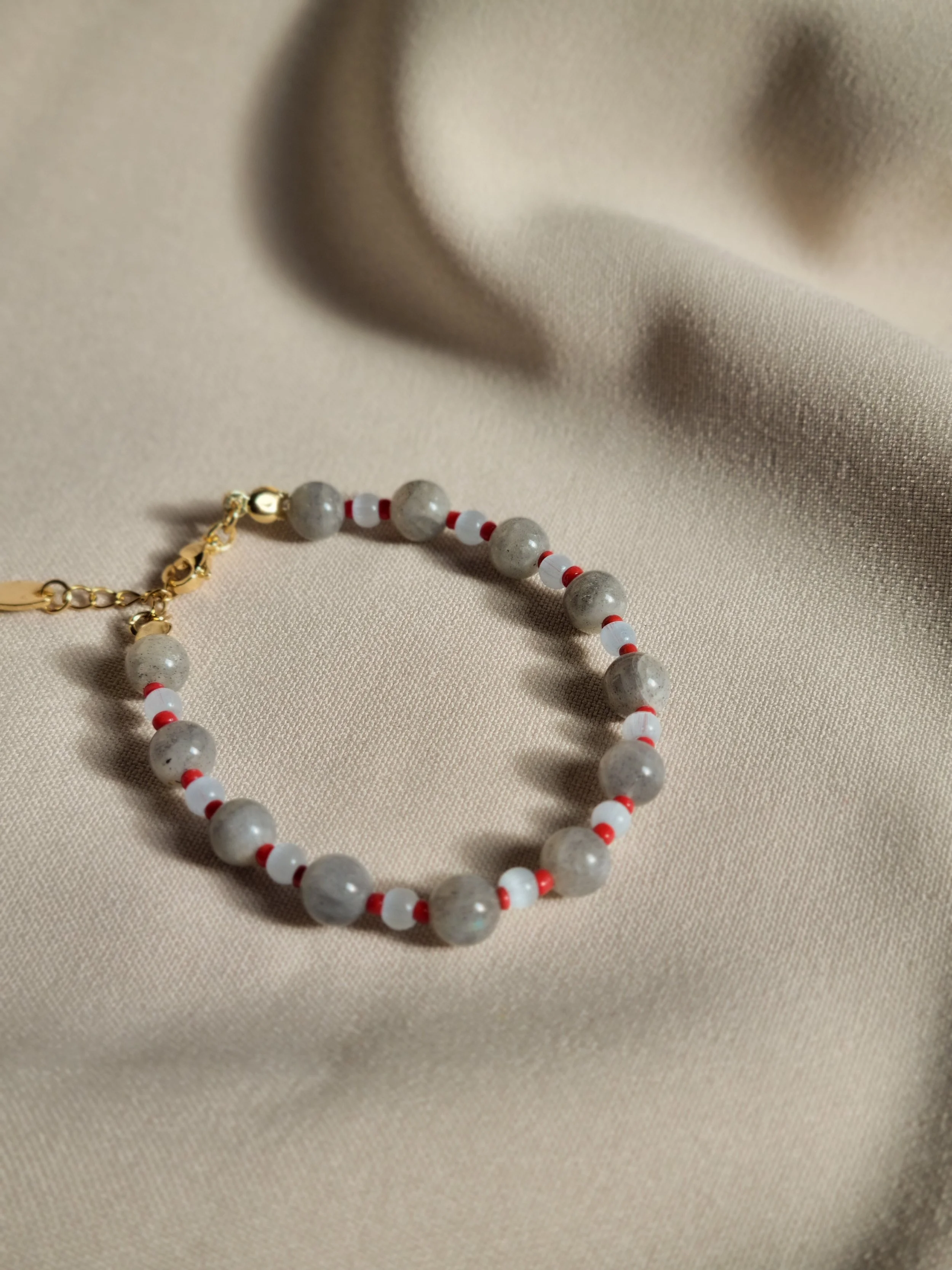 Handmade by me in my home studio in England. This beaded bracelet is strung by hand with deep pink colour seed beads, featuring small upcycled blue glass beads and labradorite gemstone beads.