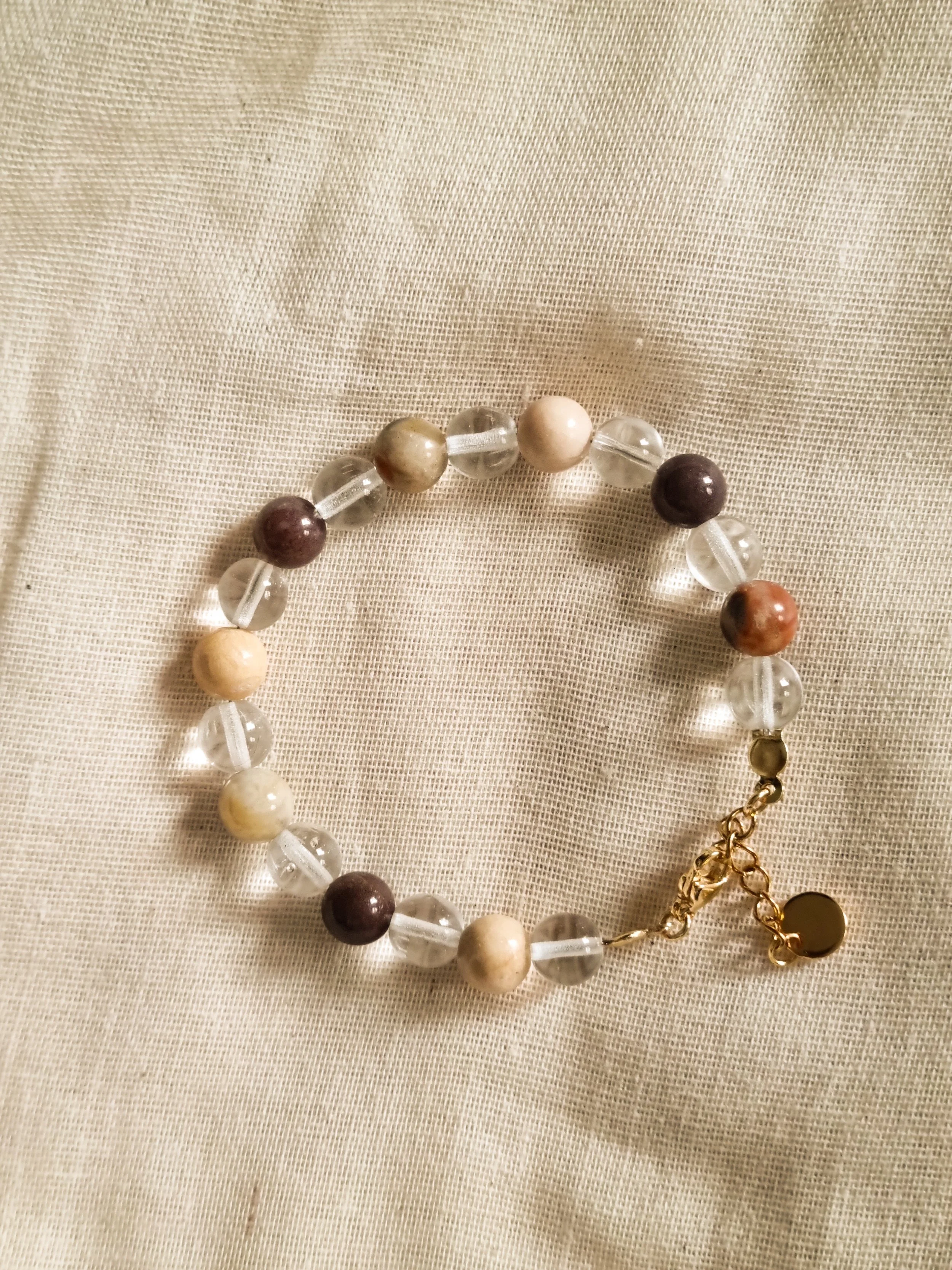 Handmade in my home studio in England. This beaded bracelet is strung by hand with mixed of cream, clear and brown upcycled vintage glass beads and semi-precious gemstones.