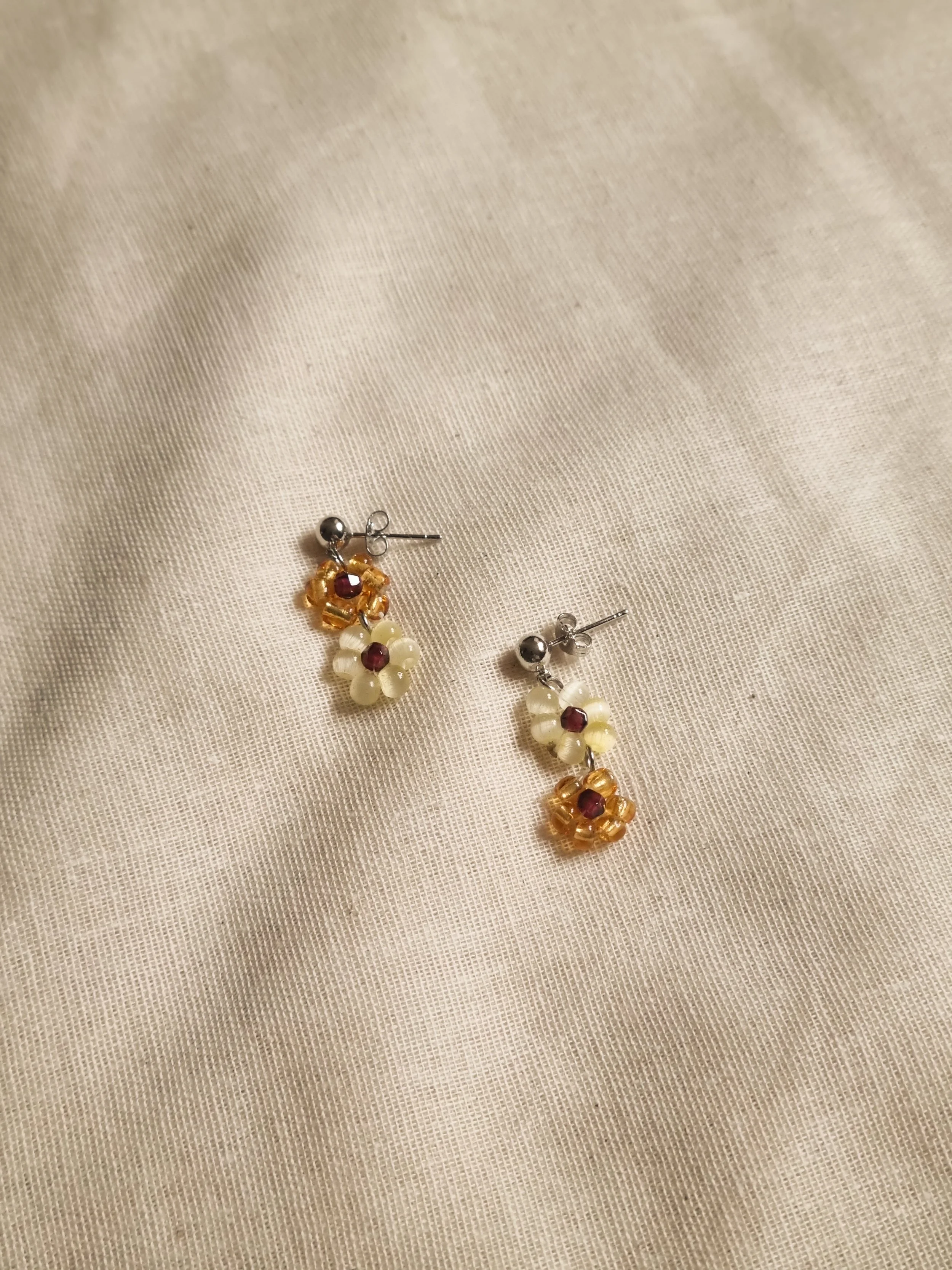 Handmade at my home studio in England, these earrings are made with upcycled vintage and old beads in small flower chain design. The beaded flower are securely attached to 925 sterling silver jump rings and earring posts.