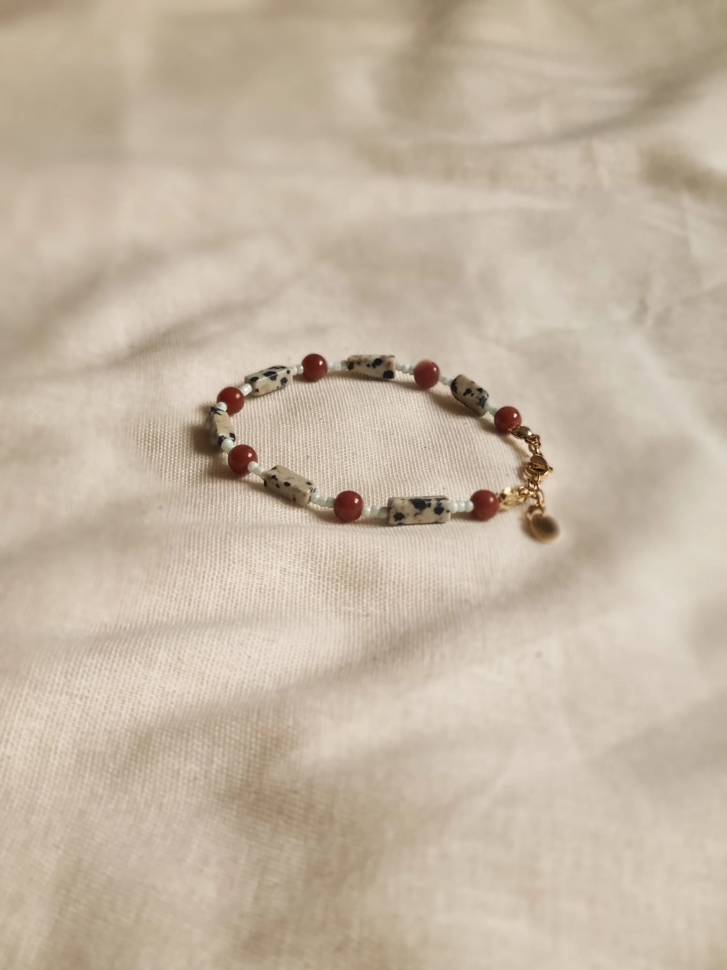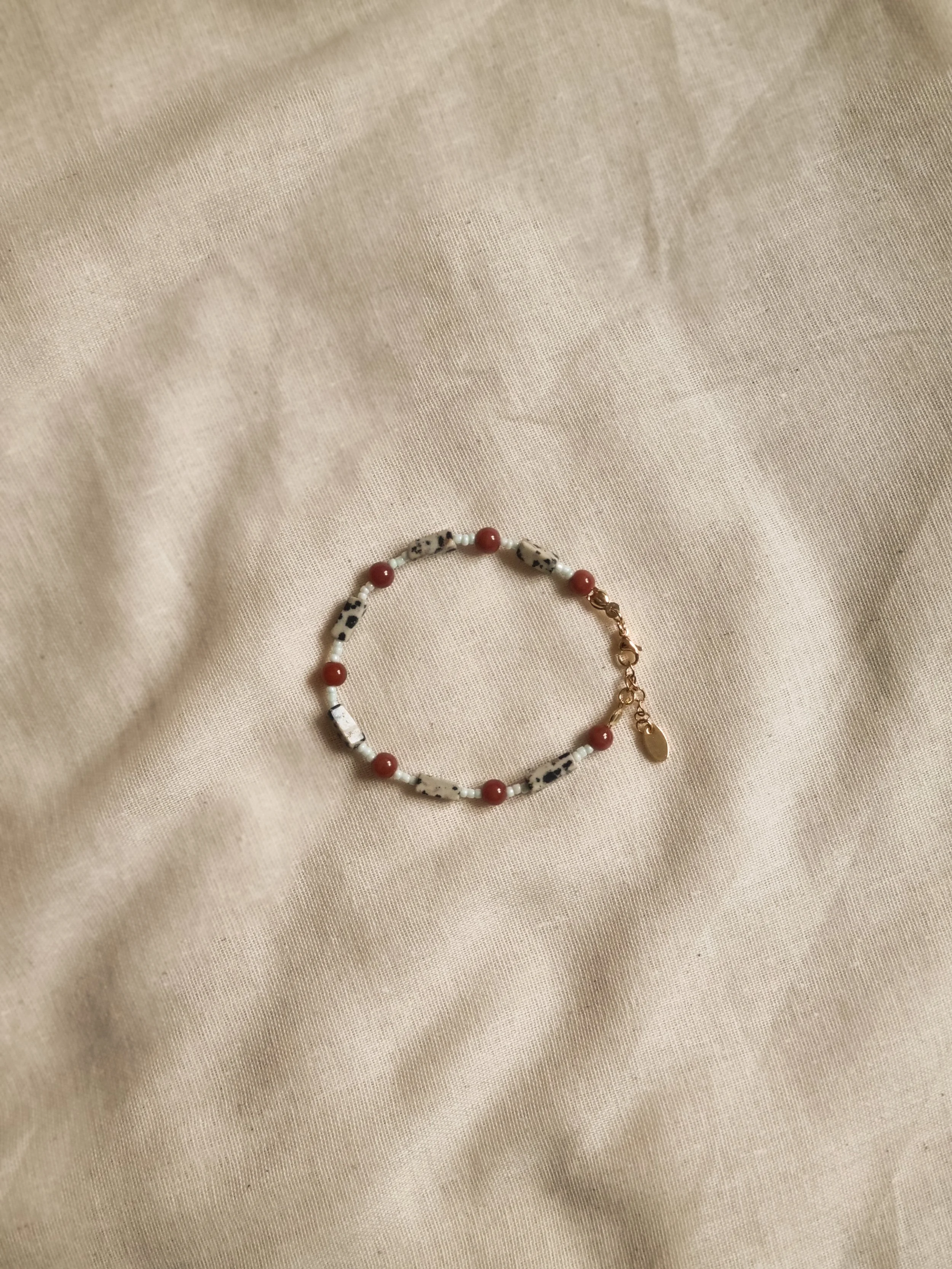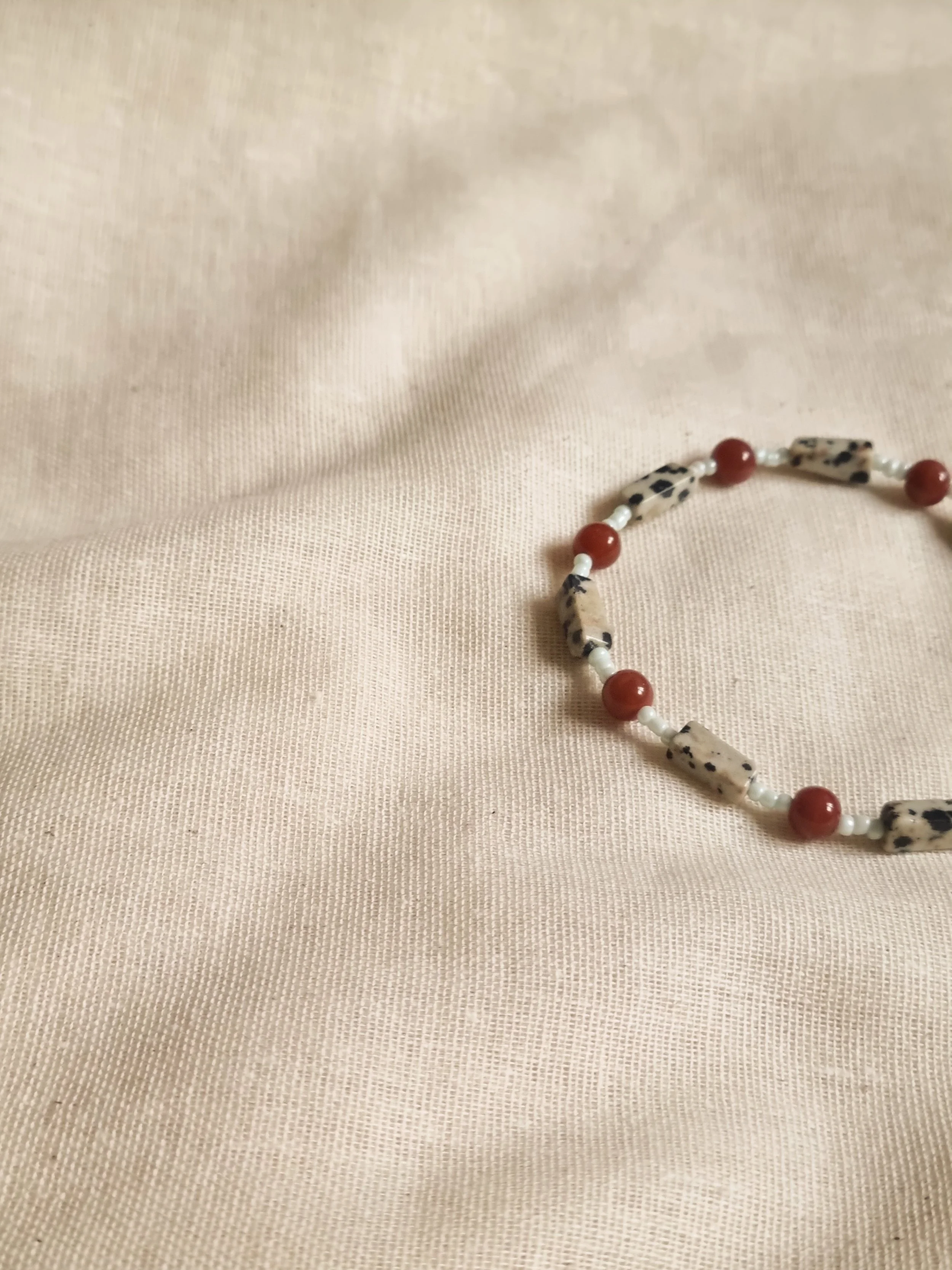 Handmade at my home studio in England, this bracelet is made with rectangular shape dalmatian jasper gemstone beads and upcycled old glass beads. Featuring gold-plated adjustable components.