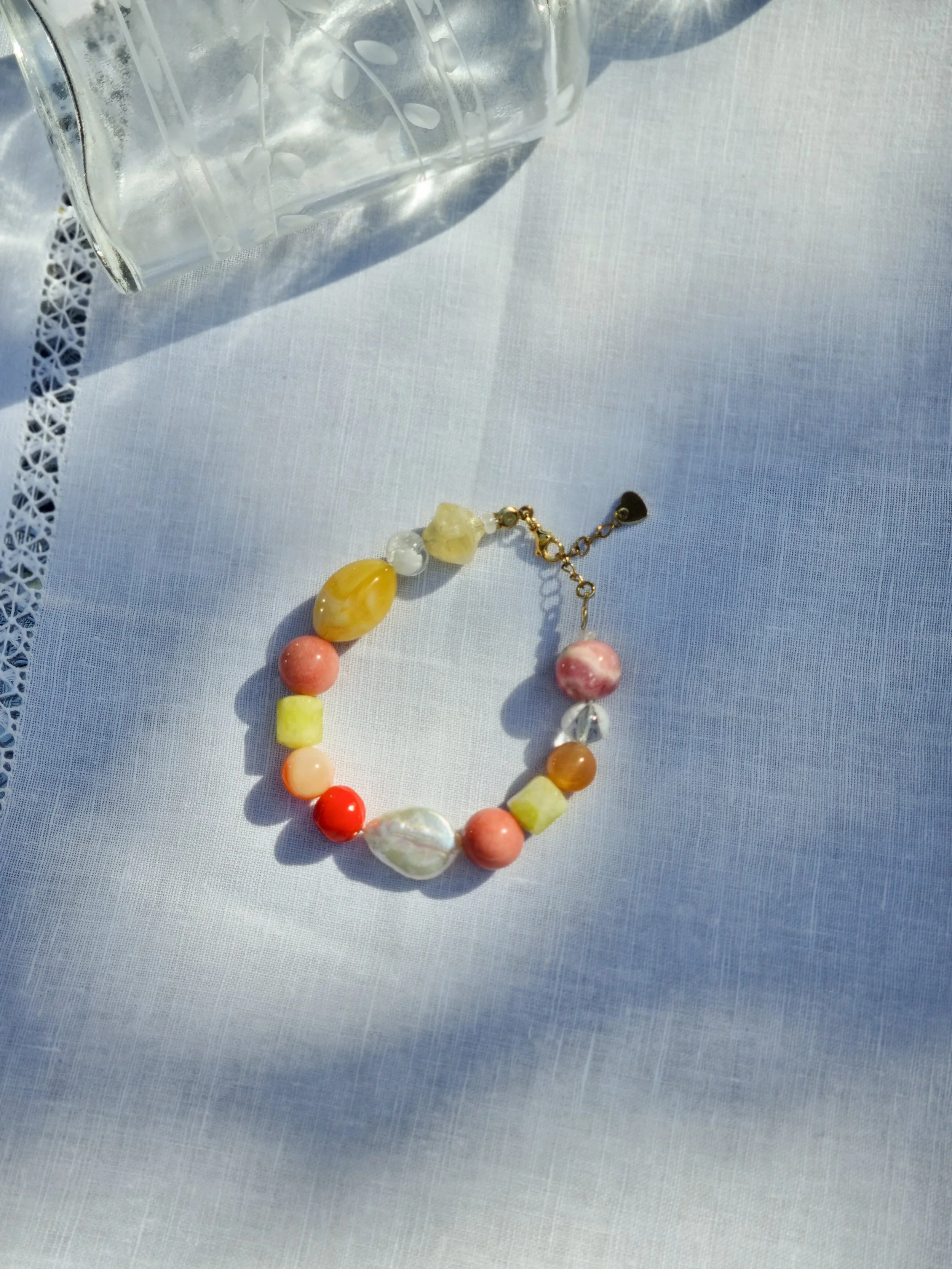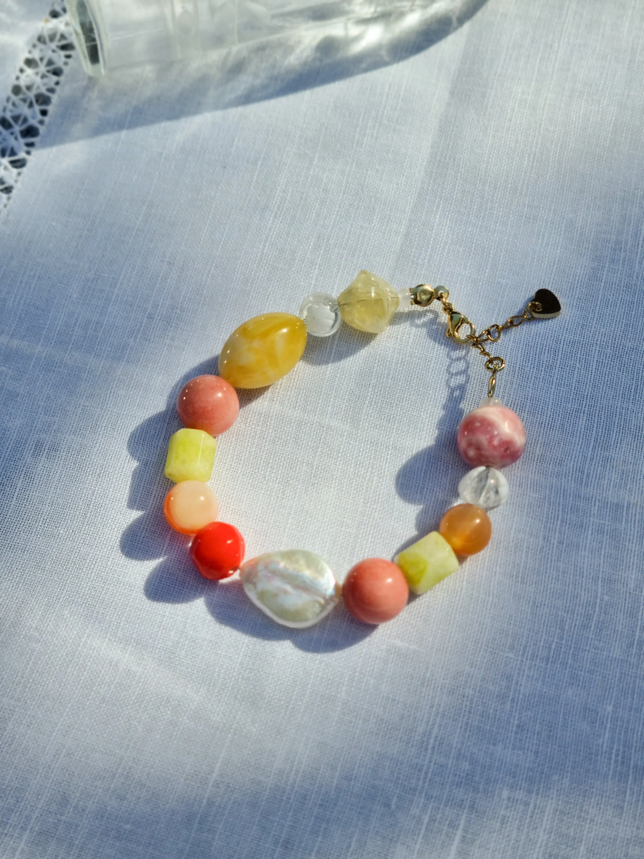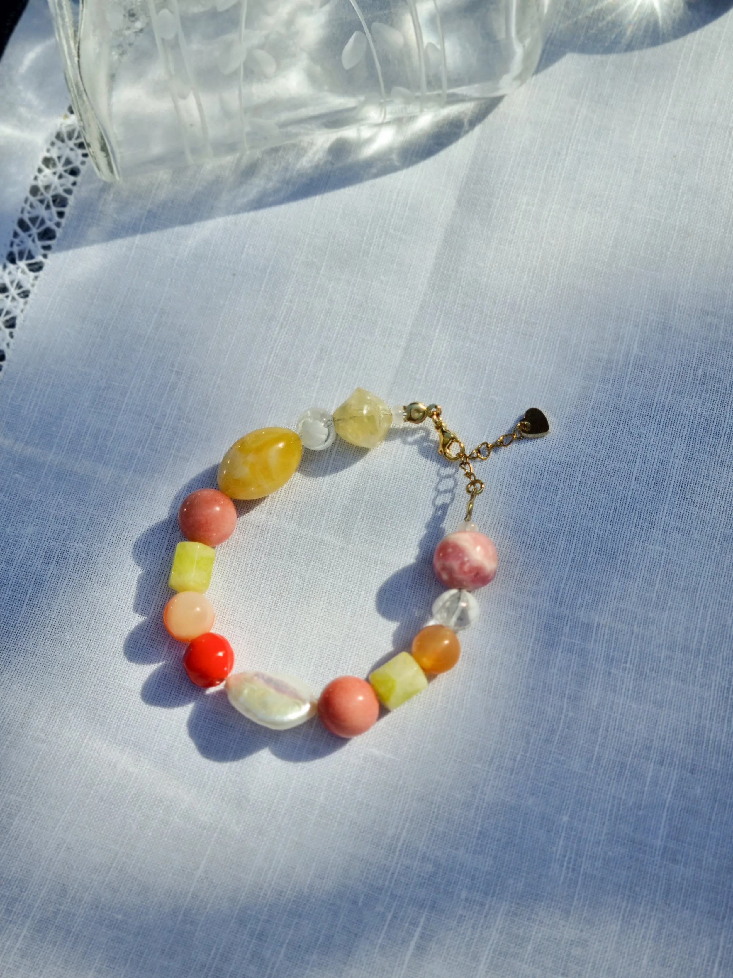 Handmade at my home studio in England, this one-off bracelet is made with upcycled vintage and old beads featuring coral, yellow, beige, red glass and gemstone beads. Featuring a keshi pearl and gold-plated stainless steel adjustable clasps.