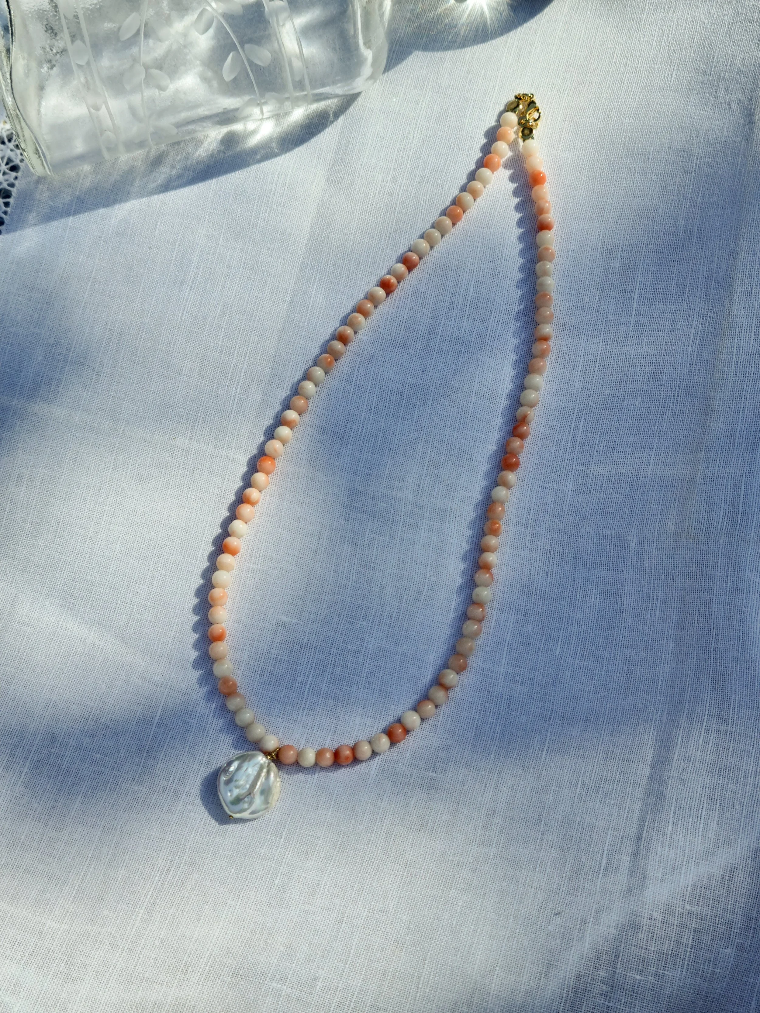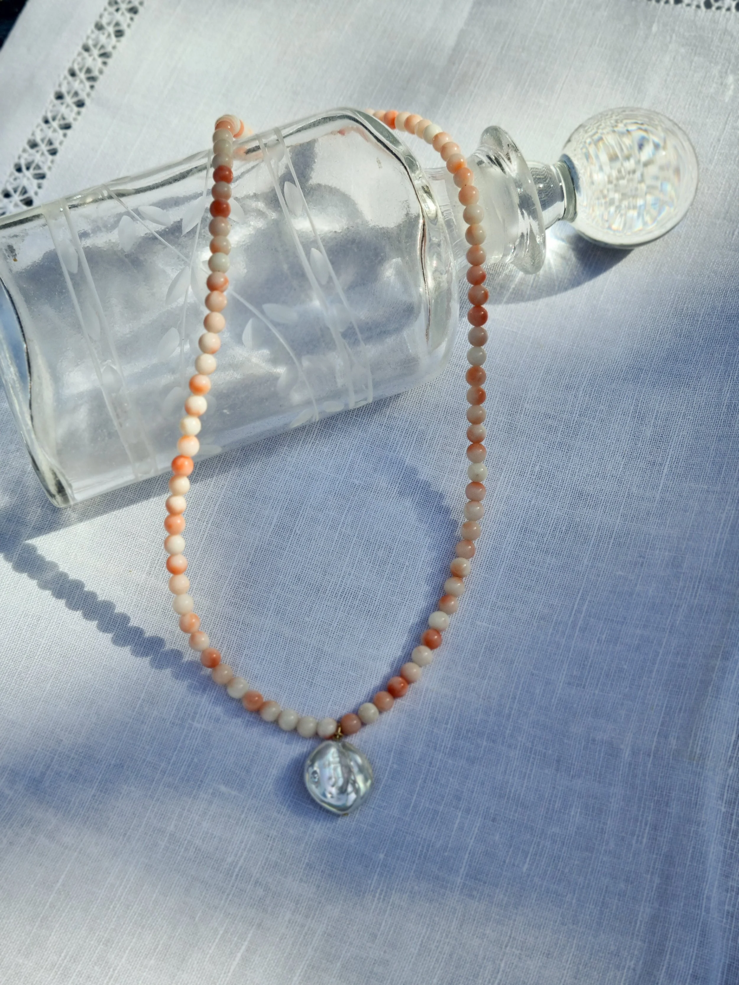Handmade in my home studio in England. This beaded necklace is strung by hand with upcycled circle shape gemstone beads and a flat keshi pearl pendant.
