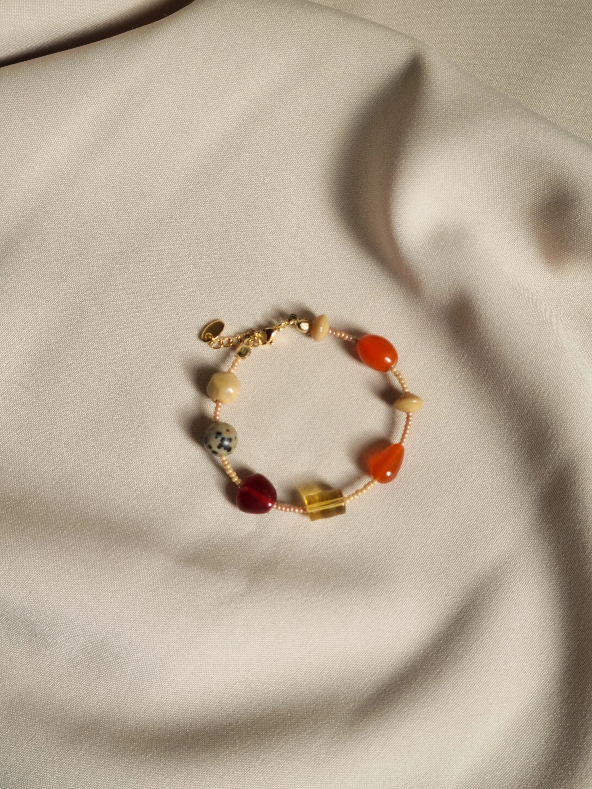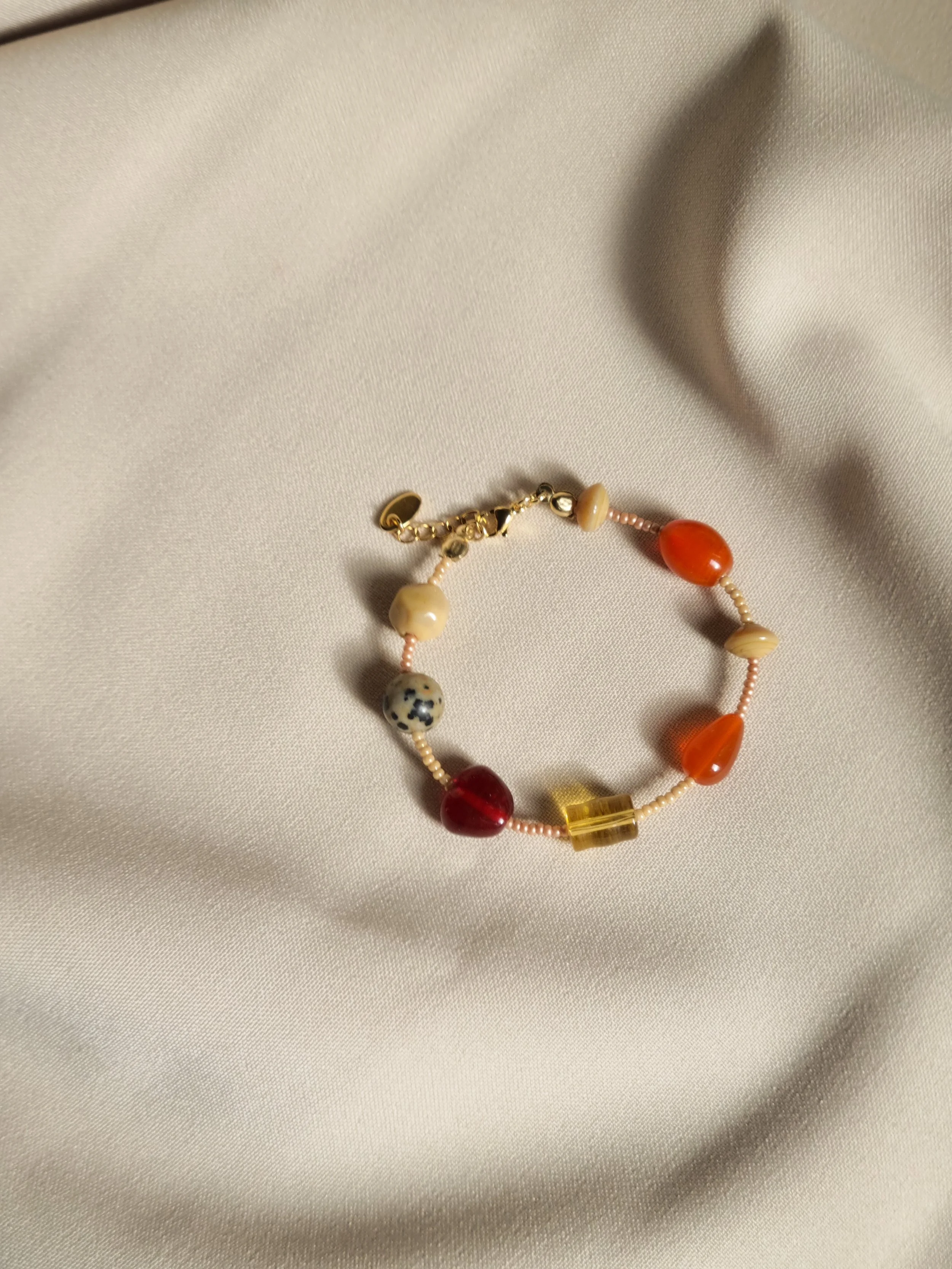 Handmade by me in my home studio in England. This beaded bracelet is strung by hand with light brown colour seed beads, featuring upcycled mixed glass and gemstone beads.
