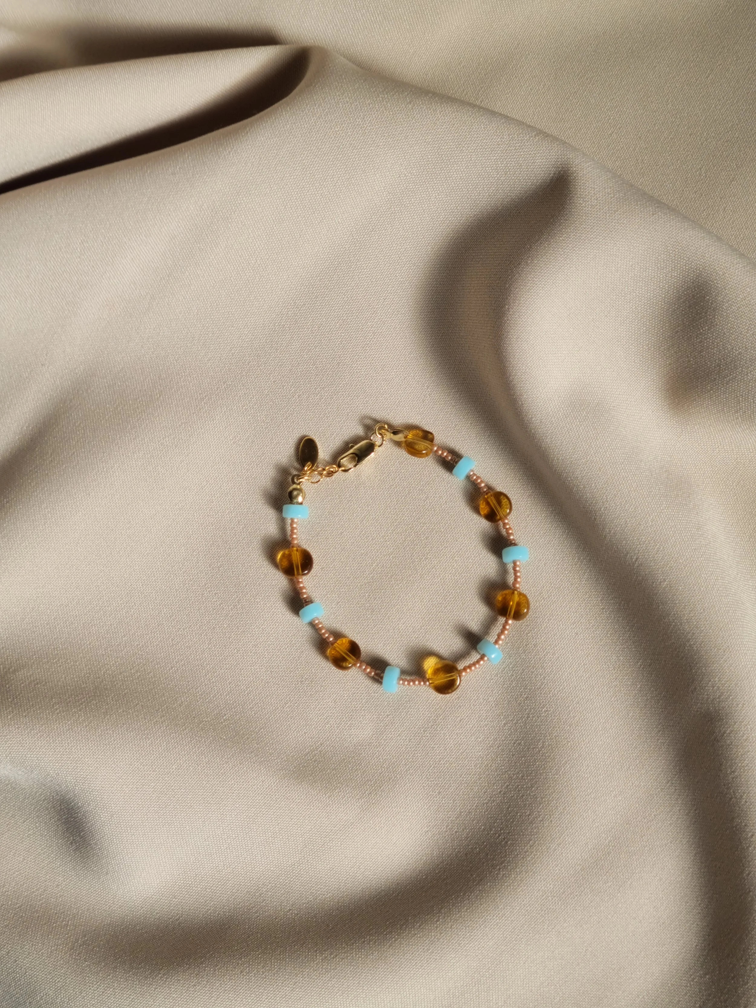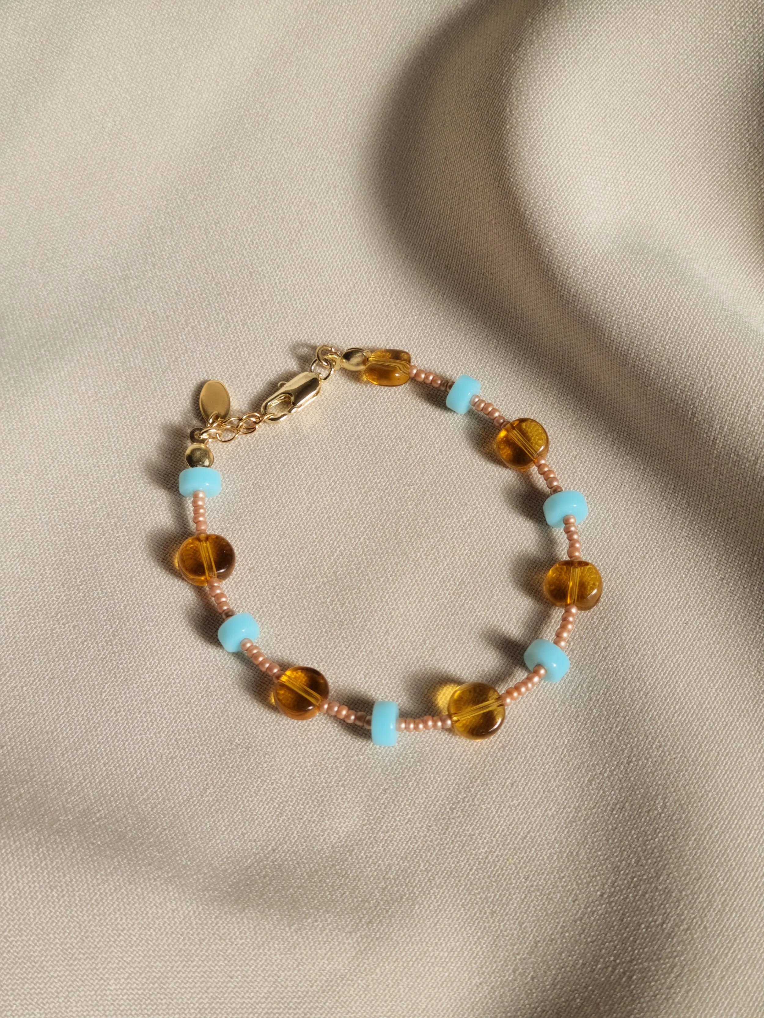 Handmade by me in my home studio in England. This beaded bracelet is strung by hand with brown seed beads, featuring upcycled amber and blue colour glass beads.