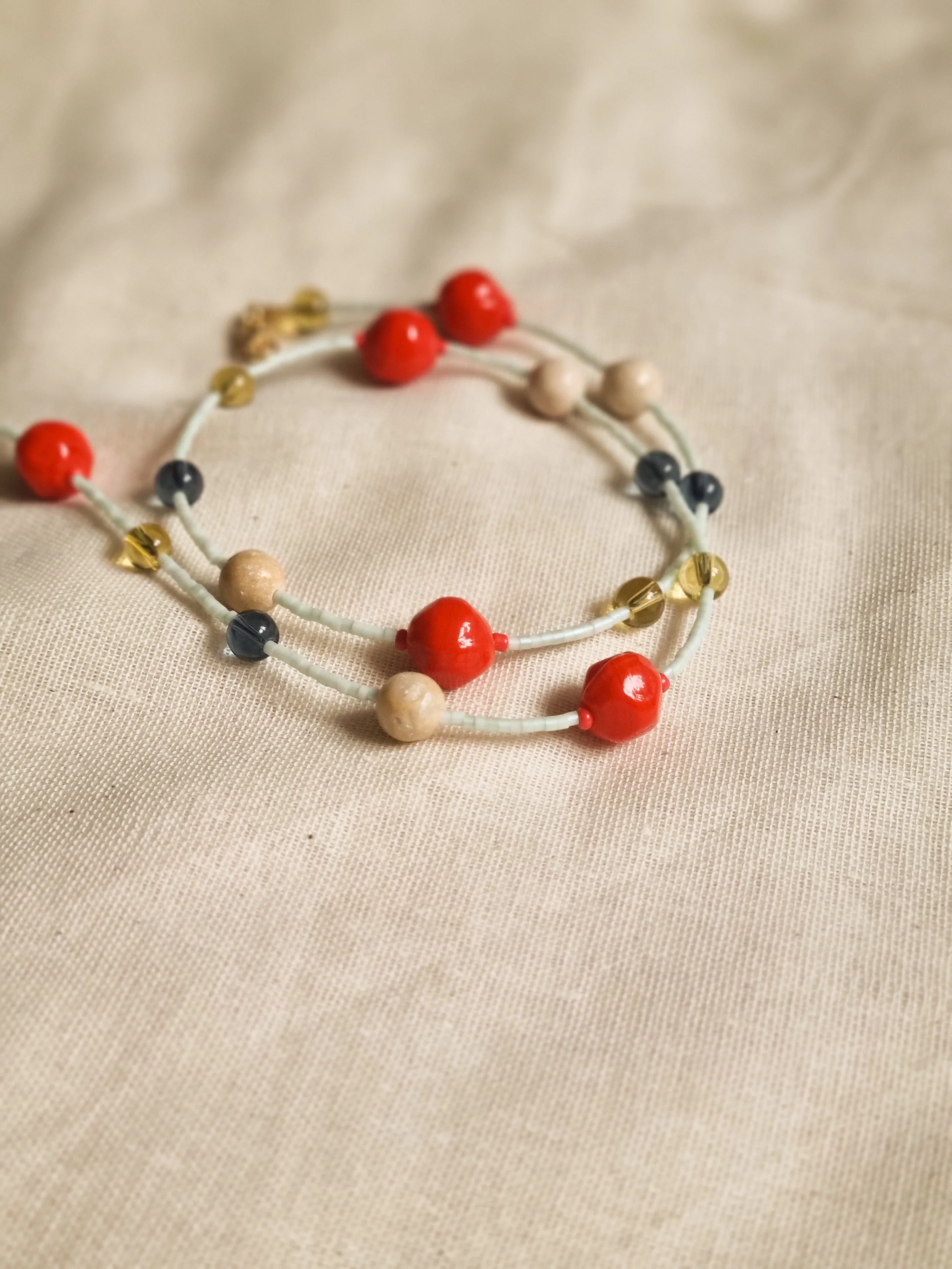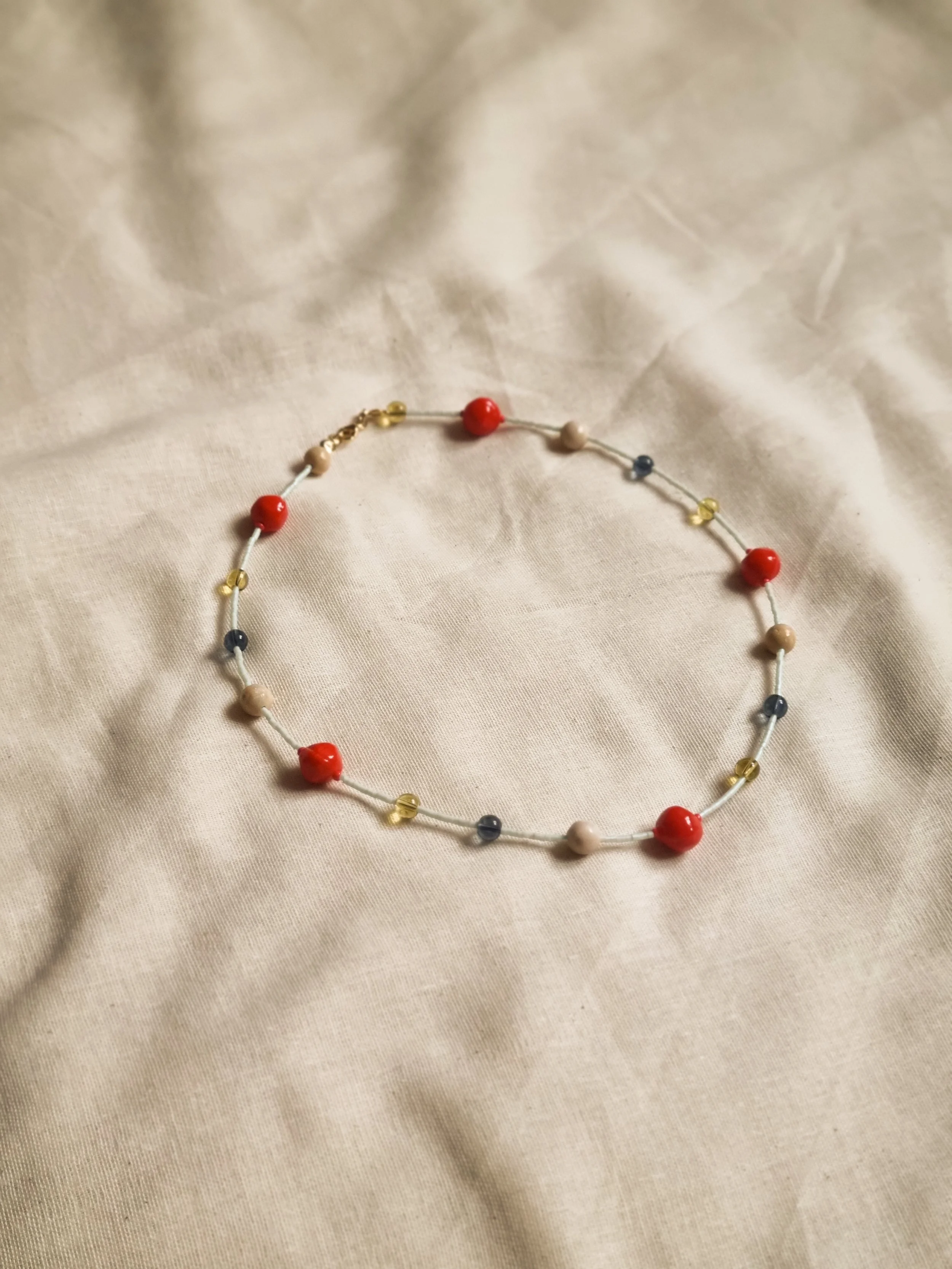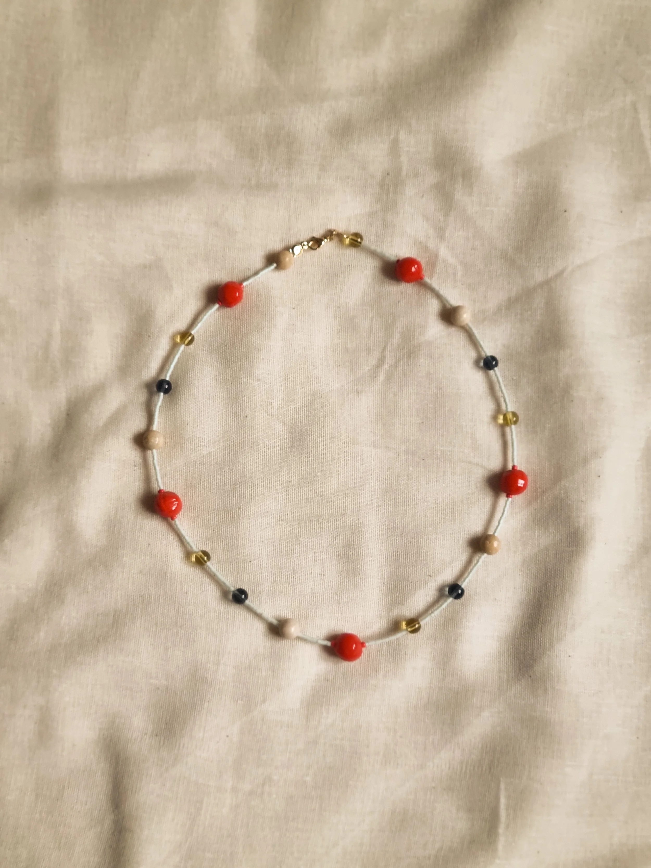 Handmade at my home studio in England, this one-off necklace is made with upcycled vintage and old beads featuring red, yellow, beige, blue glass beads and gold-plated stainless steel adjustable clasps.