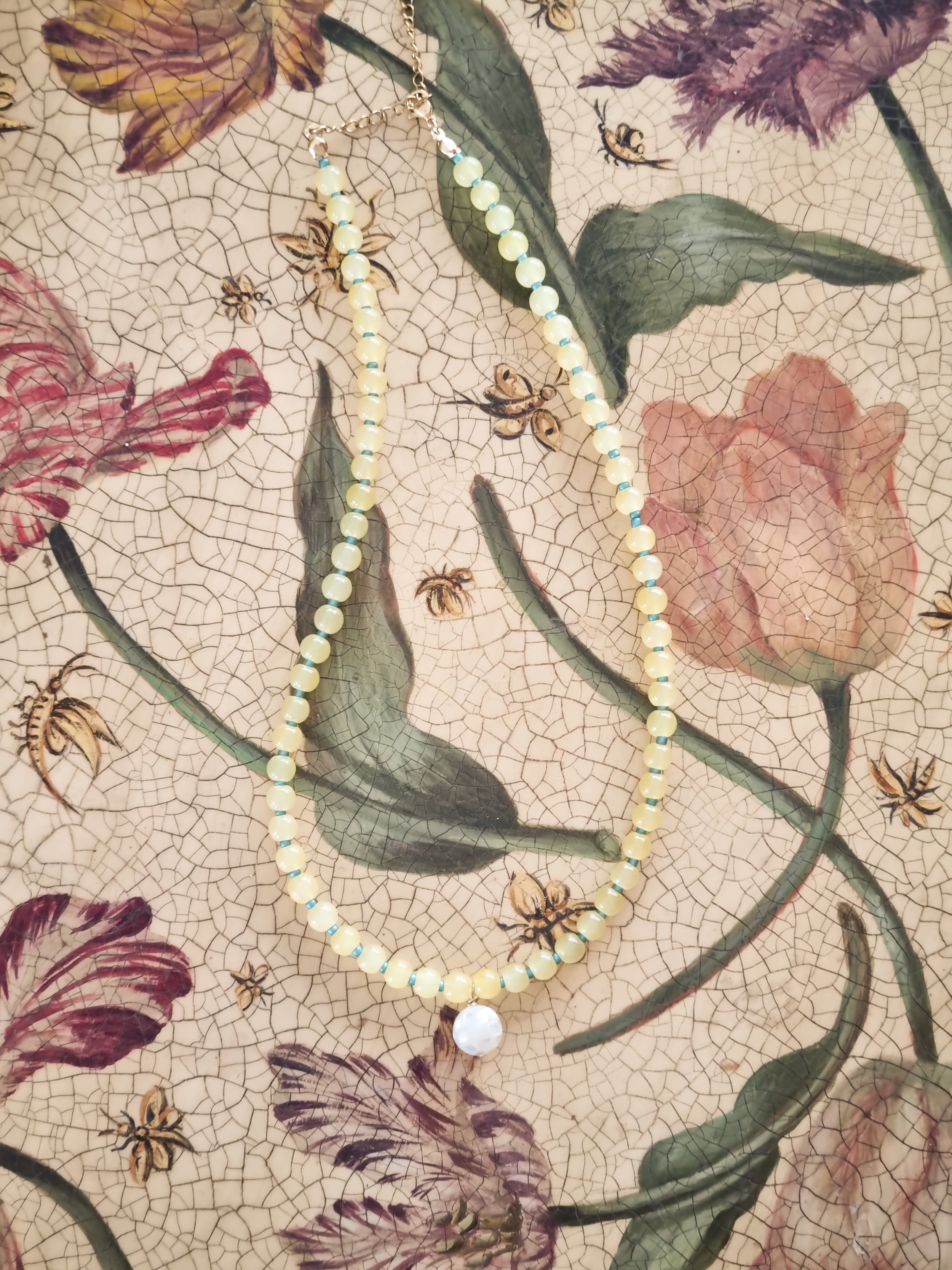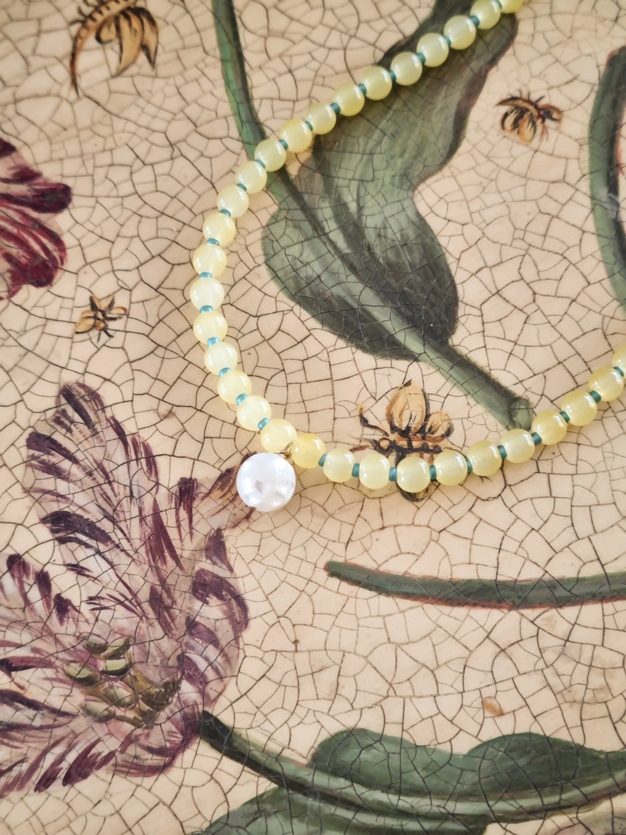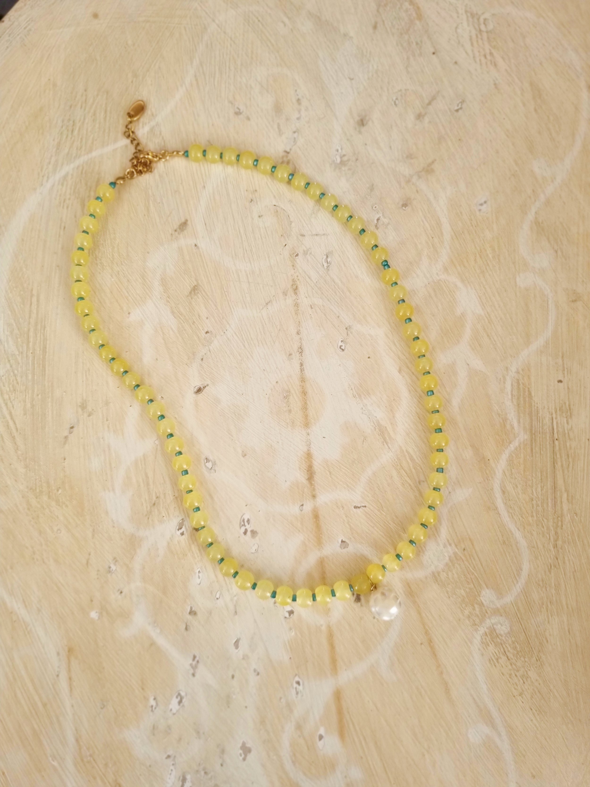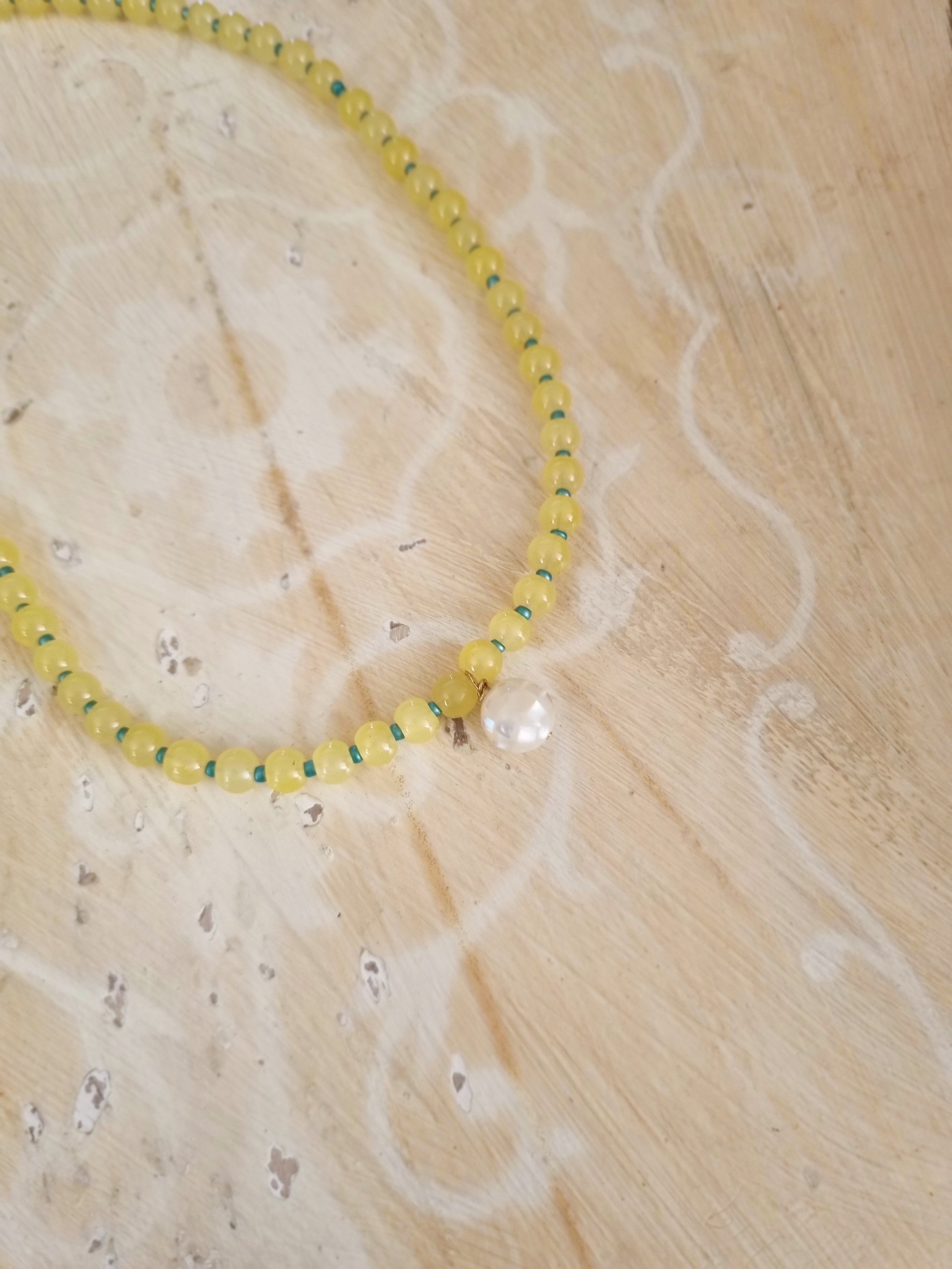 Handmade in my home studio in England. This beaded necklace is strung by hand featuring upcycled yellow round glass beads and small blue seed bead in between. I also added a mother of pearl “disco ball” bead in the middle that I have sourced and handpicked from my trip in Thailand.