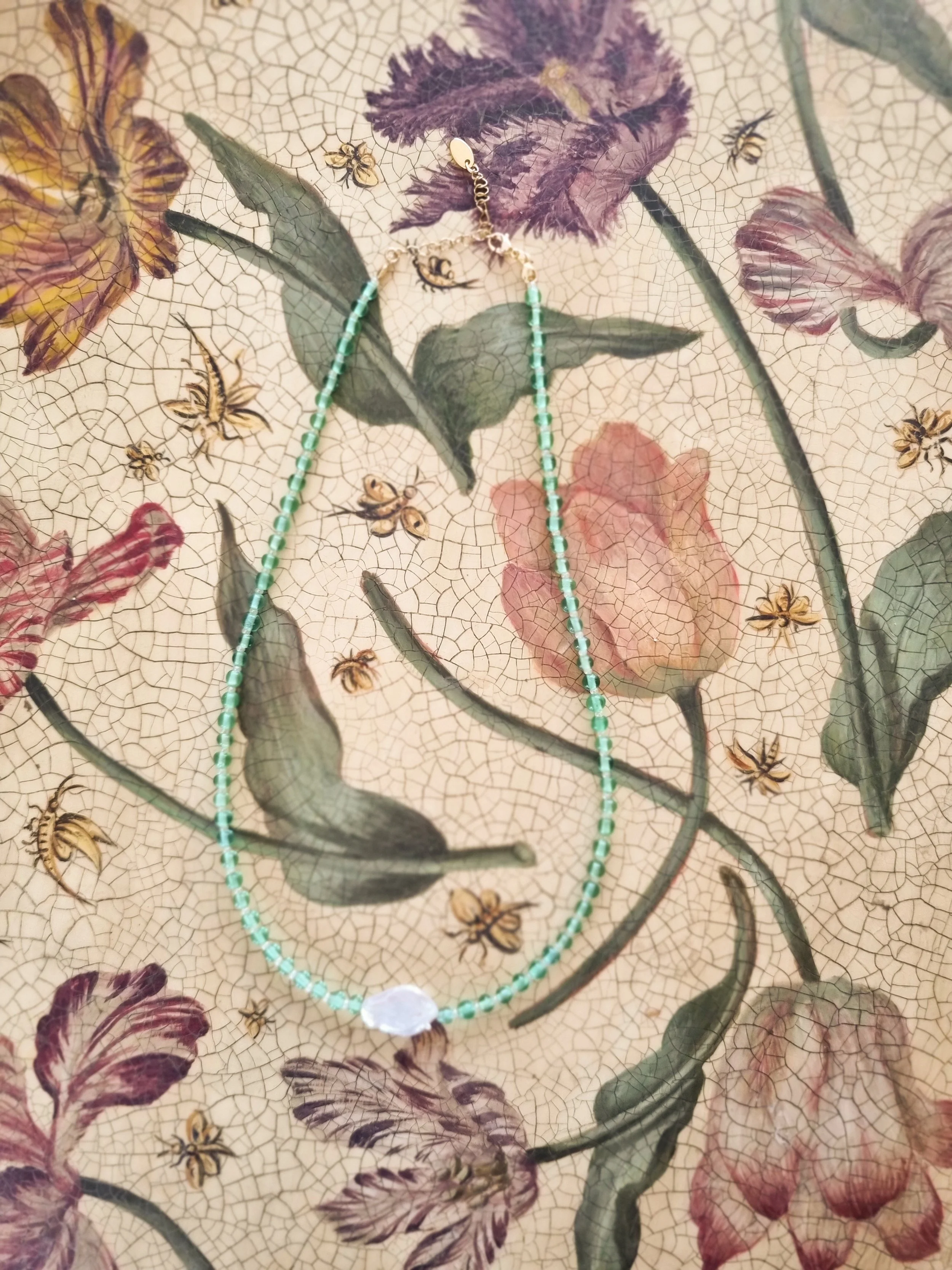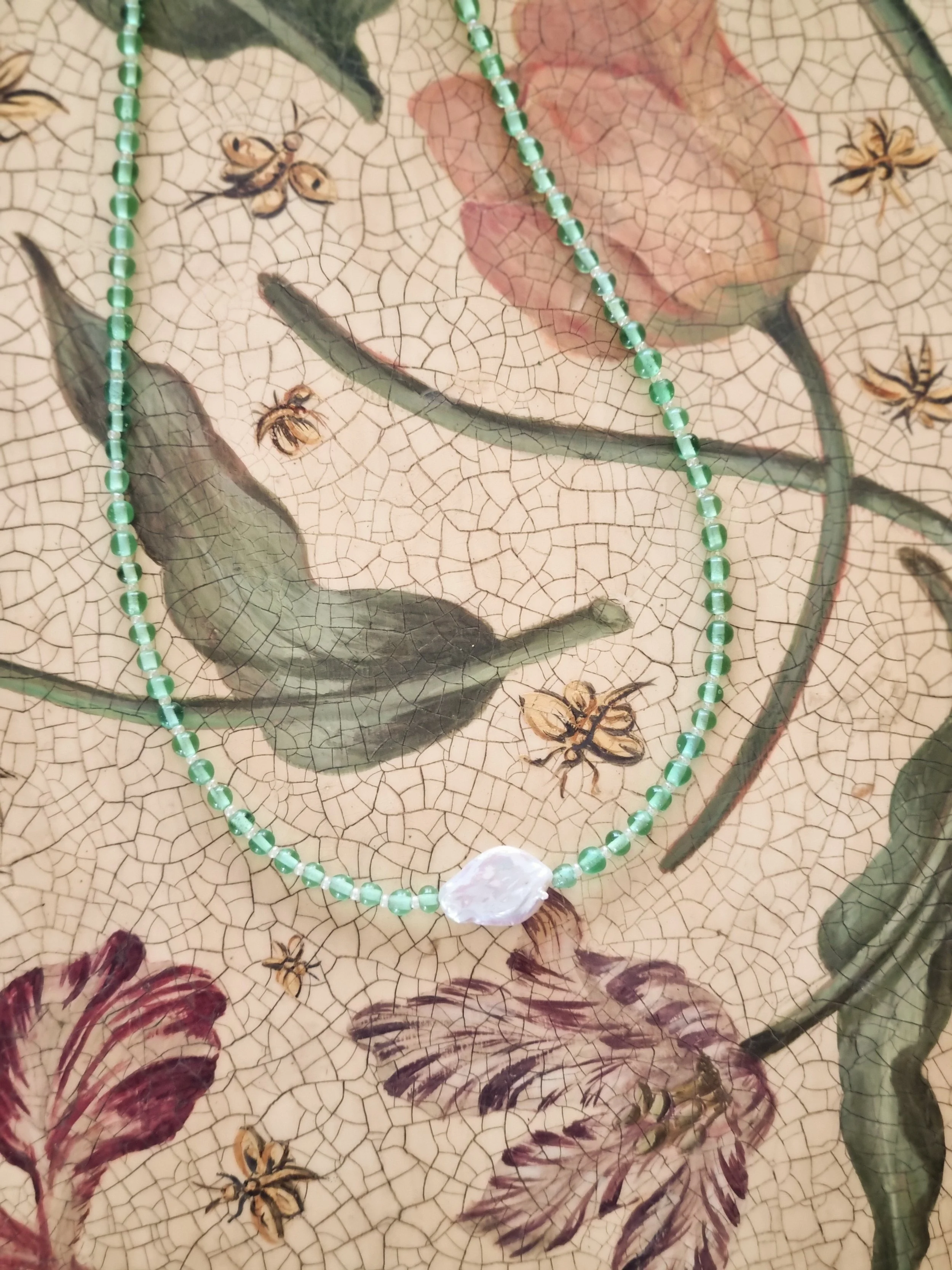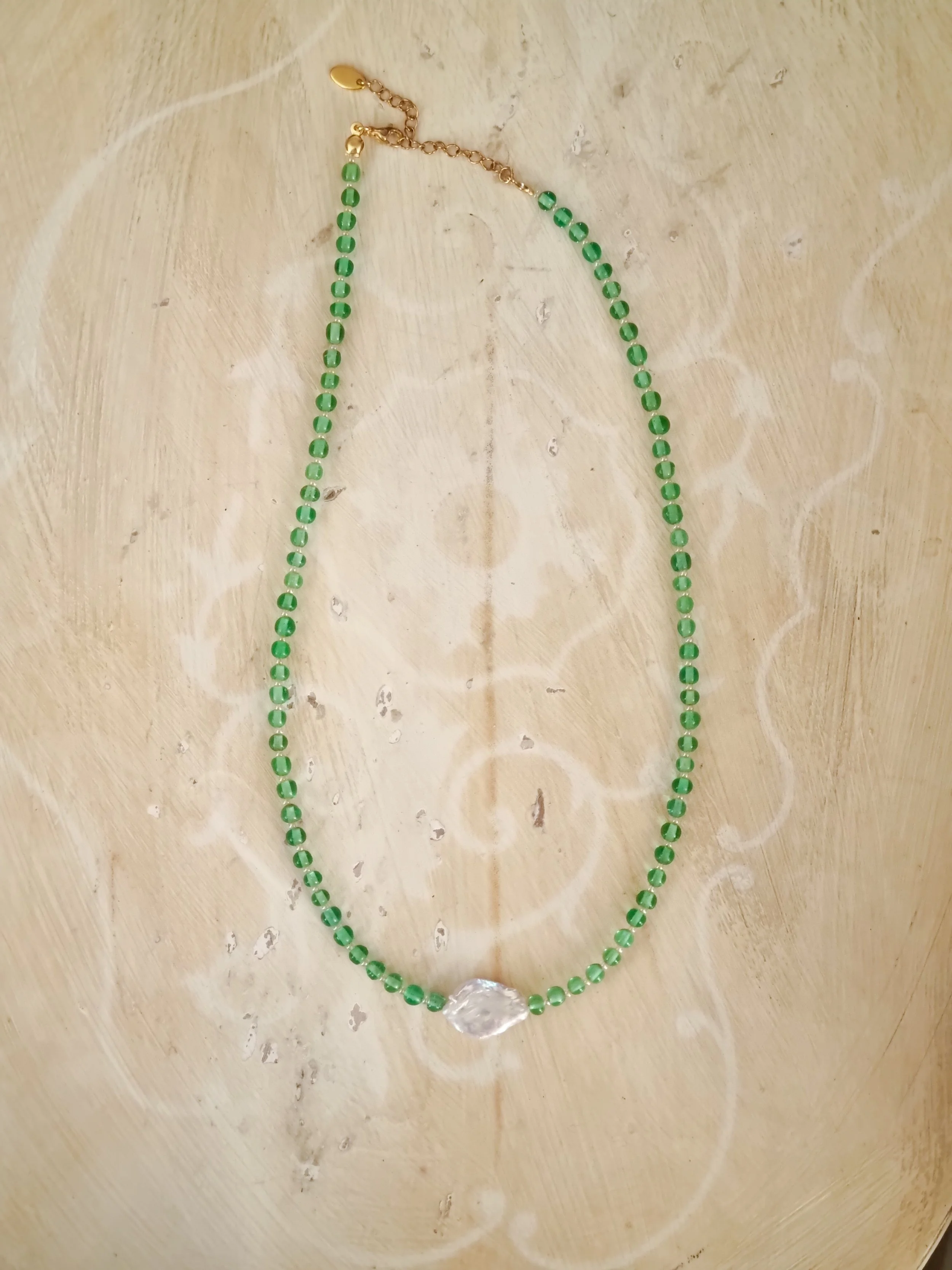 Handmade in my home studio in England. This beaded necklace is strung by hand featuring green small round upcycled glass beads and keshi pearl in the middle that I have handpicked from my trip in Thailand.