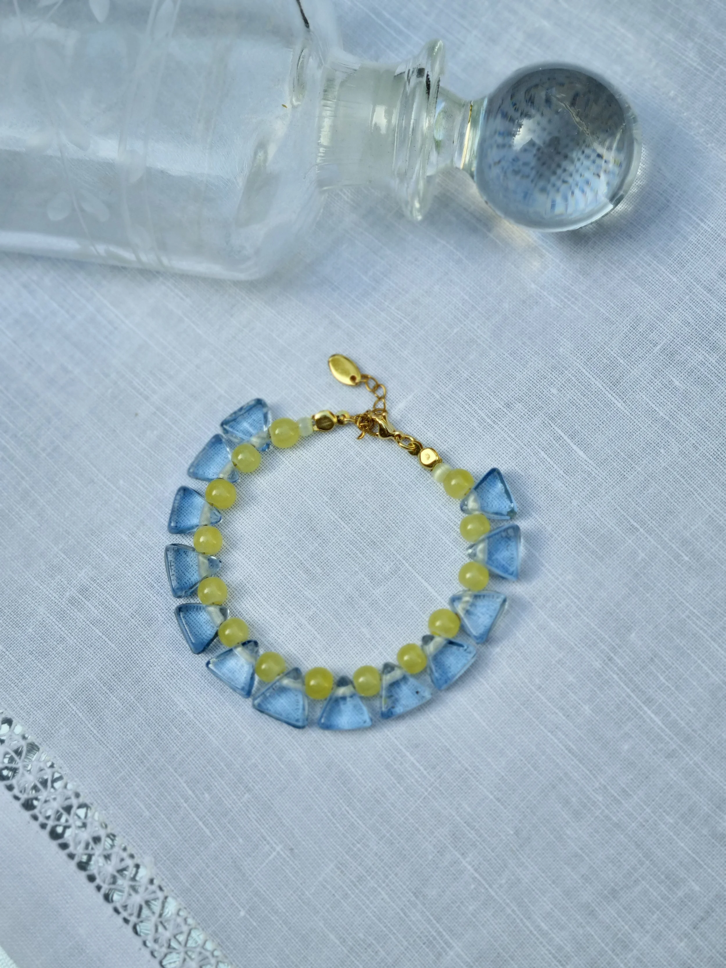 Handmade at my home studio in England, this bracelet is made with upcycled vintage and old beads featuring blue and yellow glass beads. Featuring gold-plated stainless steel adjustable clasps.