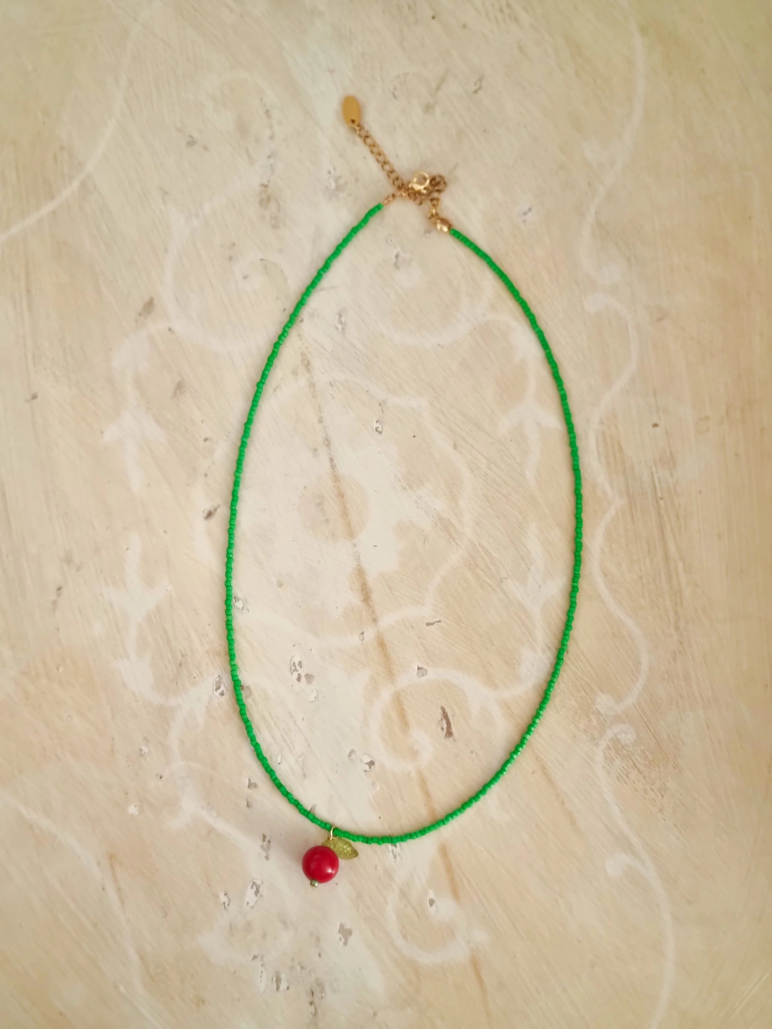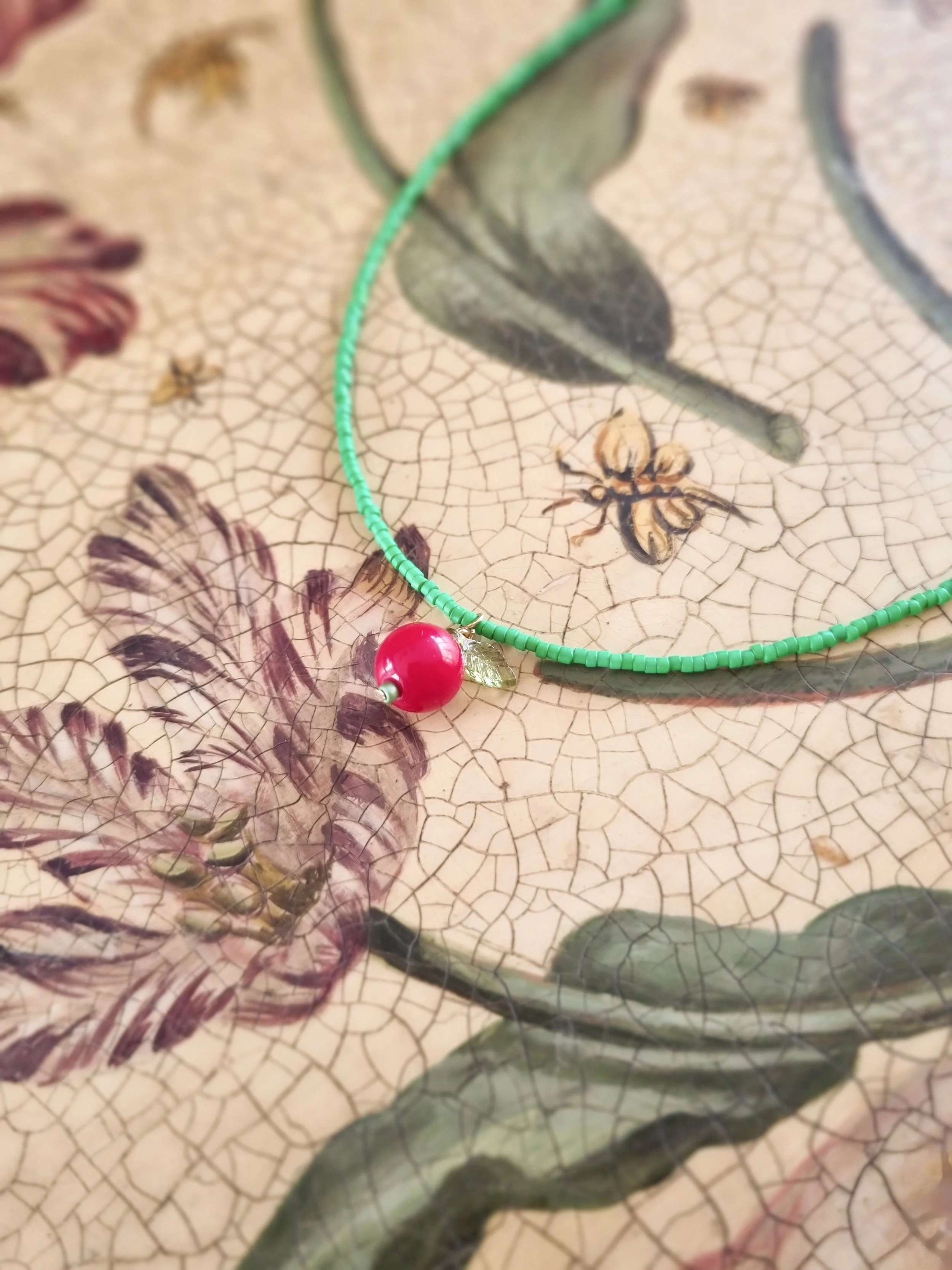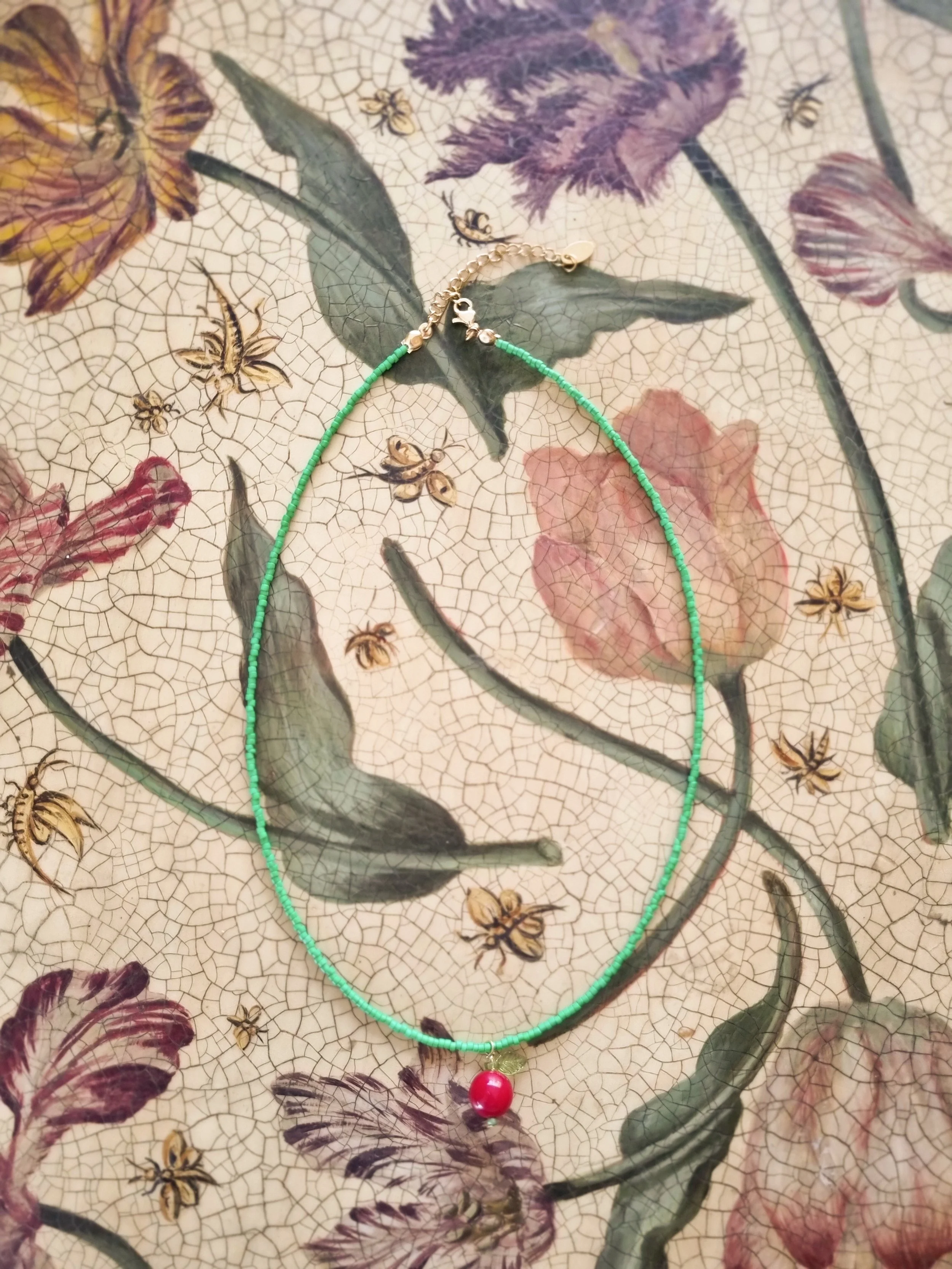 Handmade in my home studio in England. This beaded necklace was so popular when I started selling them last year. I have decided to bring them back again. Each piece is strung by hand with tiny green seed beads and semi precious red colour gemstone that I have handpicked from my trip in Thailand.