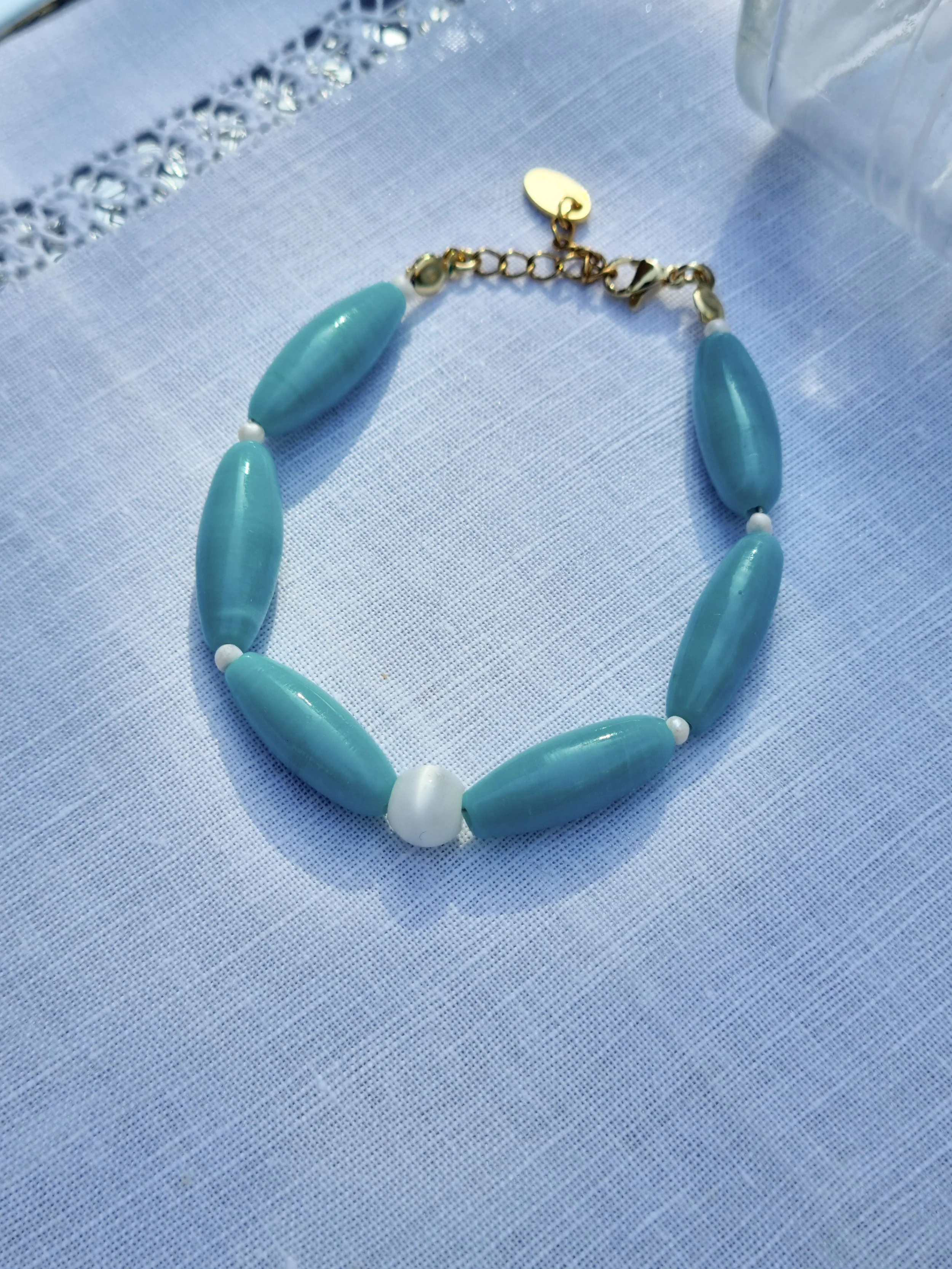 Handmade at my home studio in England, this bracelet is made with upcycled mother of pearl beads and blue tube glass beads. Gold-plated stainless steel adjustable clasps.