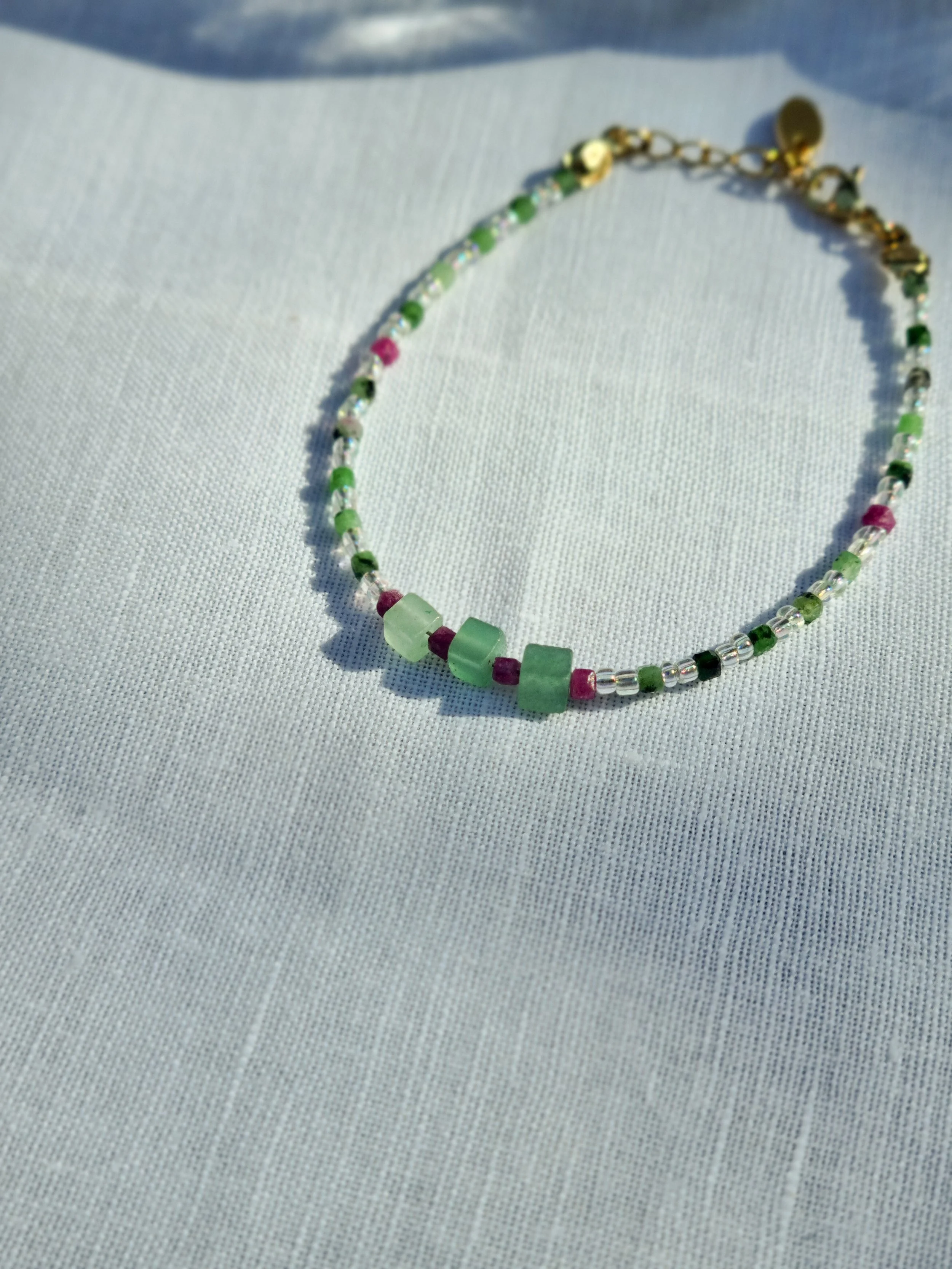 Handmade at my home studio in England, this bracelet is made with small tourmaline beads and clear seed beads. With green small natural stones in the middle. Gold-plated stainless steel adjustable clasps.
